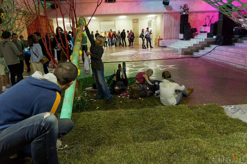 Фото №88203. Ризома. Е Якимов, С.ТрофимовЭту работу, завершающую экспозицию Е. Якимова и С.Трофимов, сами художники-авангардисты презентуют, как набат, призыв к занятию творчеством. Чтобы охватить всю разнообразную программу фестиваля приходится постоянно перемещаться от площадки к площадке. В холле, где в режиме нон-стор выступают различные музыкальные коллективы, замечаю “Райский уголок”.