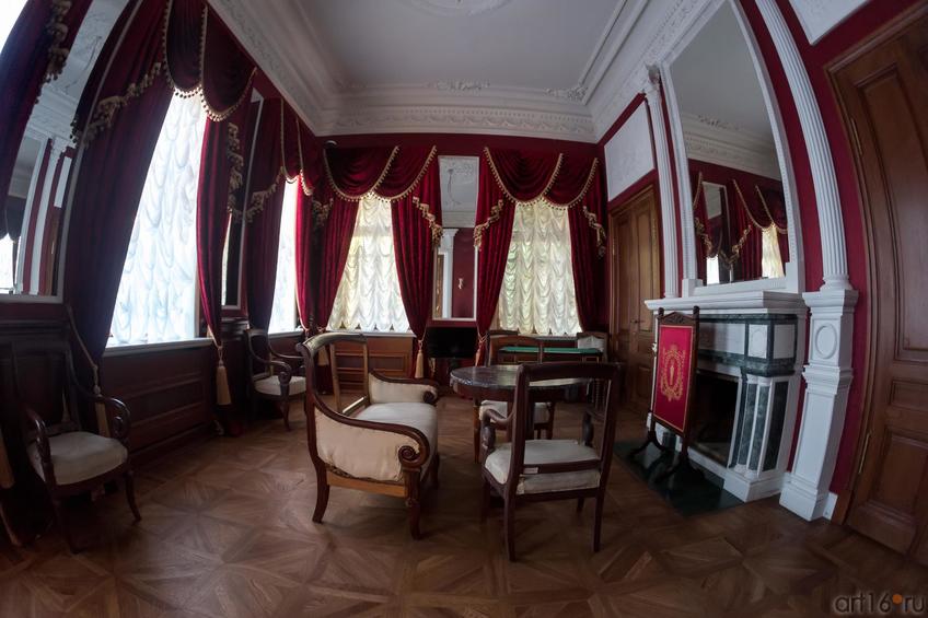 Фото №886898. Красная гостиная. Дом БанарцеваКамин установлен на месте печи. В настоящее время находится в рабочем состоянии. Антикварная мебель в стиле ампир.