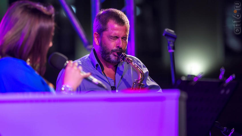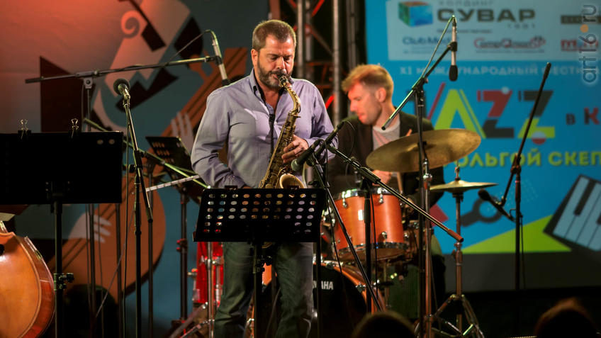 Фото №932726. Art16.ru Photo archiveПрограмму «Великая музыка кино» исполнил итало-российский квартетРозариоДжулиани (RosarioGiuliani – саксофон, АлексейПодымкин — фортепиано, АсхатСайфуллин — контрабас, CашаМашин — барабаны). special guest — ОльгаСкепнер (вокал)
