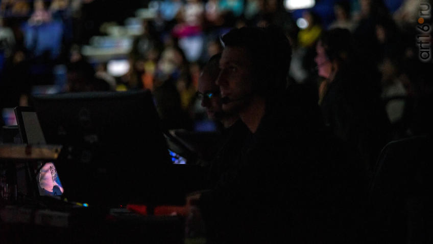 Фото №966141. Art16.ru Photo archiveШоу «Кристал» - технически сложное шоу. Все оборудование: свет, видео и пр. путешествует вместе с постановкой. В закулисье находится центр управления. От него в техническую сетку идут провода и кабели. Здесь "рождается" свет, звук. За кулисами расположено рабочее место одного из техников. В режиме реального времени он видит, что происходит на сцене. Под потолком стадиона размещены 28 серо-чёрных короба с огромными линзами - это проекторы. Благодаря им зеркало льда заливается видеопроекциями и создаются основные элементы сценографии.