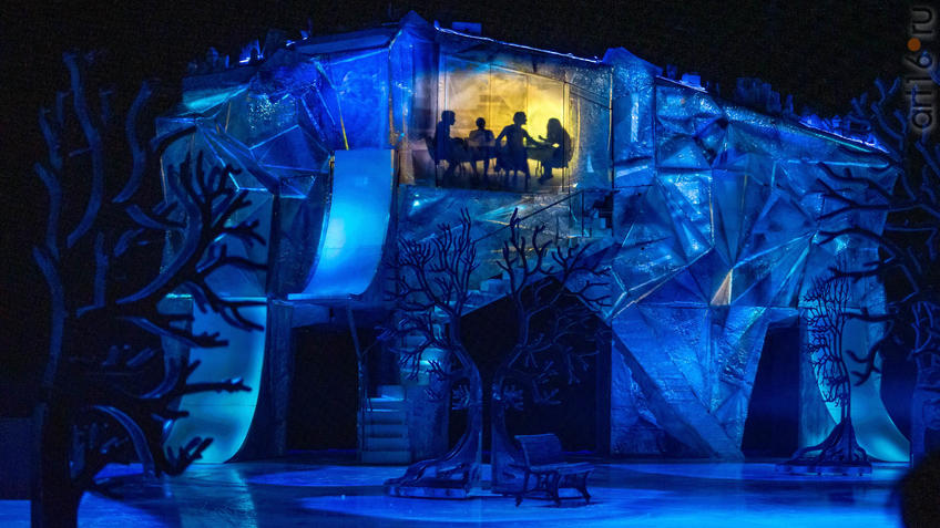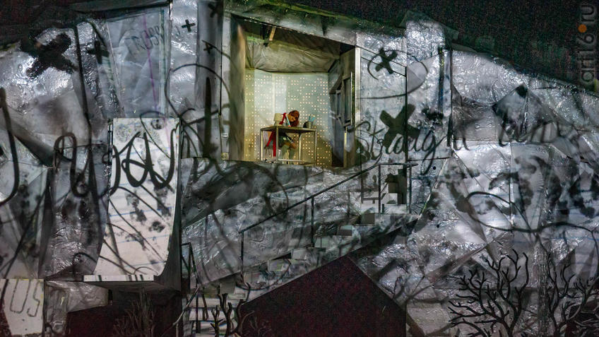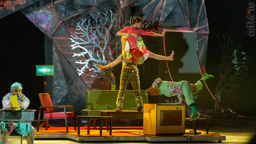 Фото №966316. Art16.ru Photo archiveМного места занимает реквизит (парты, стулья для эквилибра, пилоны и мн. др.), это обусловлено постоянной сменой декораций. То перед зрителем комната Кристал, то то задний двор с качелями, то городской парк... Школьный двор, сменяется игровой площадкой. Та, в свою очередь, превращается в хоккейную коробку. Гигантский пинбольный автомат замещается офисной башней. Все это происходит молниеносно.