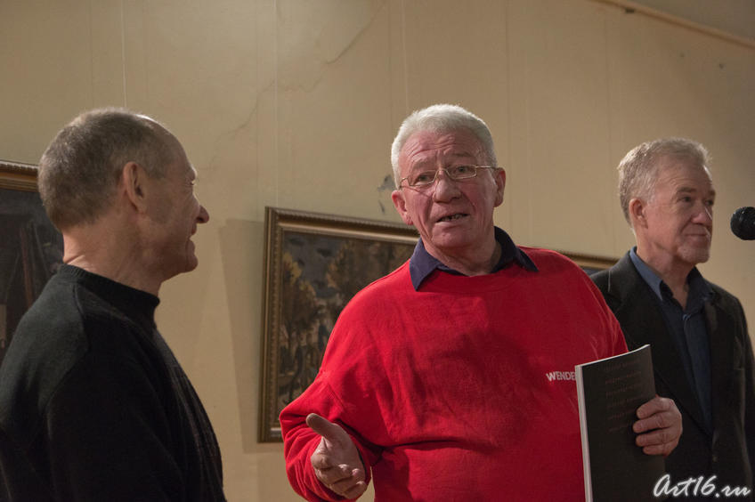 Фото №69289. В центре: Башмаков Игорь НиколаевичЧлен Союза художников России. Заслуженный деятель искусств РТ, Лауреат премии РТ имени Б. Урманче, Член Союза художников России и Татарстана.Игорь Николаевич Башмаков, художник декоративно-прикладного искусства в своем выступлении на открытии выставки отметил, что в Советское время у входа в Выставочный зал Союза художников (название по принадлежности) выстраивалась очередь как в мавзолей. “Здесь проходили, сменяя друг друга, вернисажи, связанные с различными направлениями изобразительного искусства, демонстрировались моды. Свои работы показывали советские и зарубежные художники. Здесь были Глазунов, Томский, Васильев.... - рассказывает Игорь Николаевич. “Живопись Анатолия Бугакова вдохнула в этот зал живую энергию, московский дух” - заключает Башмаков.