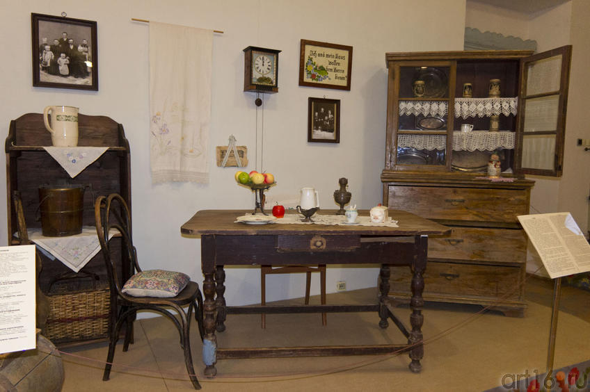 панно \"шпрух\", семейная фотография, стол обеденный, комод, шкаф посудный и пр. Первые немецкие колонисты в Крыму появились в 1787-1788 гг. Это были “данцигские поселенцы”, большинство которых вскоре покинуло Крым. Оставшиеся немцы занимались ремеслом и поденной работой. В дальнейшем переселение немцев приобрело организованный характер: ежегодно 200 семей из Германии выезжали в Крым на основе предварительного отбора и поселялись на побережье. В начале XIX века образовались колонии в Судаке, Отузах, Цюрихтале, Фридентале, Гейльбурне. Селились и в городах, где занимались ремеслом и торговлей. Они вели обособленный образ жизни, избегая широких контактов с населением, что объяснялось особенностями вероисповедания (католицизм и протестантизм). В 1841 году немецкие колонии в Крыму владели десятью тысячами десятин земли и продолжали расширяться. К концу XIX века хозяйства немецких колонистов производили около трети товарного зерна, выращиваемого в Крыму. Отличались зажиточностью. К 1913 году численность немецкого населения Крыма превысила 40 тысяч человек. В годы Первой Мировой войны часть немцев была выслана в Поволжье. Во Время Великой Отечественной войны в течение нескольких дней из Крыма было выслано свыше 60 тыс. немцев. С 1991 года началась работа по обустройству репатриантов, созданию условий для возрождения национальной культуры. В Крыму действует Республиканское общество немцев Крыма “Видергебург”. Отдельным экспозиционным комплексом представлены схемы и картограммы этнического состава населения Крыма по данным переписей 1897, 1926, 1939, 1970, 1989, 2001