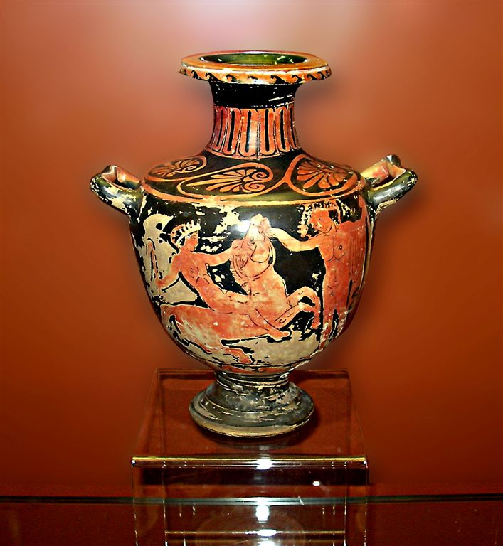 Глина, чёрный лак, бело-розовая накладная краска. Высота 24.5 см; диаметр устья 9.2 см.