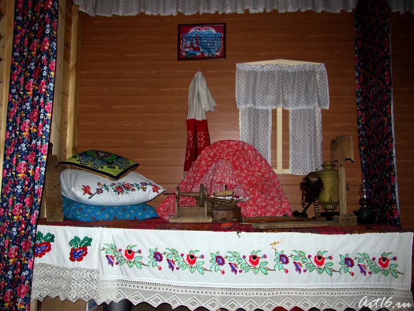 Деревянная кровать (СЕКЕ) (Н. Наратбаш - закупка), занавес для колыбельки, вышивка ручная для кровати, ичиги (19, 20в - 2 пары), прялка, калфак (обновить), комзол (обновить), утюг (3 разновидности), платье жен. татарское, украшения (браслет, серьги, чулпар, кольца, брошь), ткацкий станок.