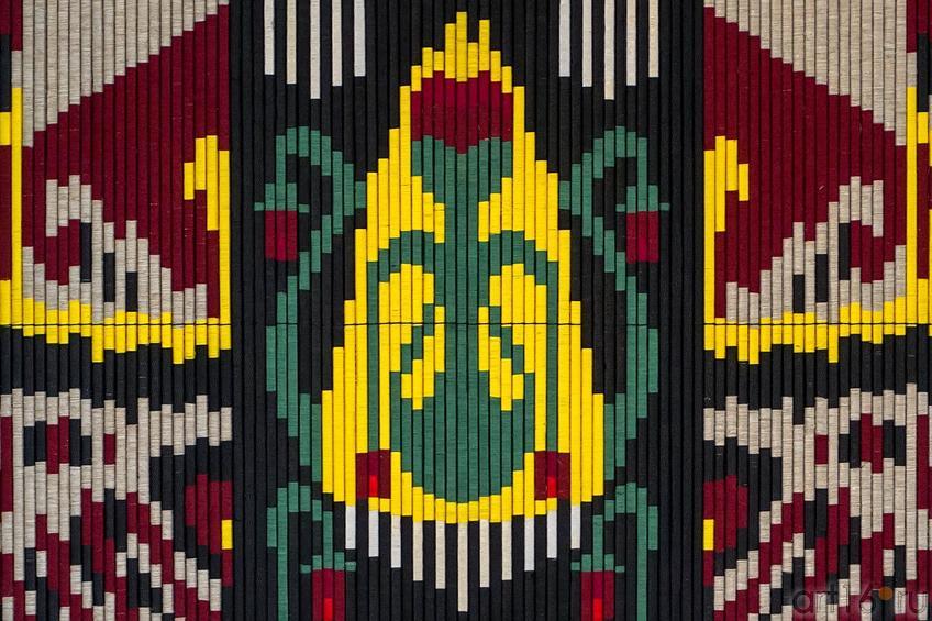 Фото №135965. ПАТЛАЙ ВЛАДИМИР ОБЕРЕГ Чий, шёлк, шерстьПлетение из чия — традиционная художественная техника среднеазиатского народного прикладного искусства, в котором, как материал используется растущий в степи тонкий тростник — чий. Высушенные стебли чия оплетают шерстью, окрашенной в разные цвета, в результате чего изделие покрывается узором.