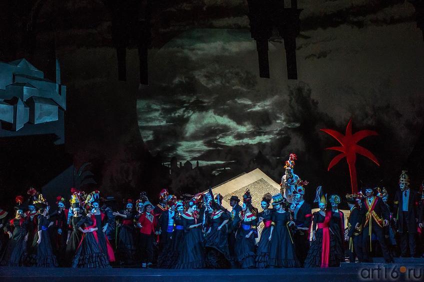 Фото №138694. Art16.ru Photo archiveДульсинея, вышедшая в первом акте на ходулях (не знаю точно, как это было реализовано), маски на лицах толпы, роднят постановку с комедией дель арте (комедией масок). Забываешь, что звучит французская речь, перед глазами является Италия.