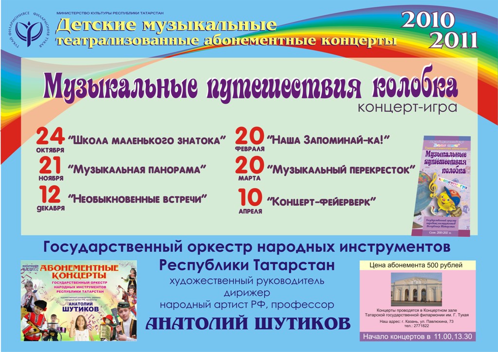 Фото №74329. «Музыкальное путешествие Колобка»10 апреля - в 11.00, 13.00 ч. - "Концерт-фейерверк". Детский абонементный концерт Государственного оркестра народных инструментов РТ из цикла "Музыкальные путешествия Колобка" (Колобок в стране детских песен, мультиков и хорошего настроения). Дирижер - народный артист России, профессор Анатолий Шутиков. Цена входного билета 150 рублей 11 апреля - 8.00-18.00 ч. - в Татарской государственной филармонии имени Габдуллы Тукая пройдет VI Международный конкурс-фестиваль Анатолия Шутикова «Народные мелодии».