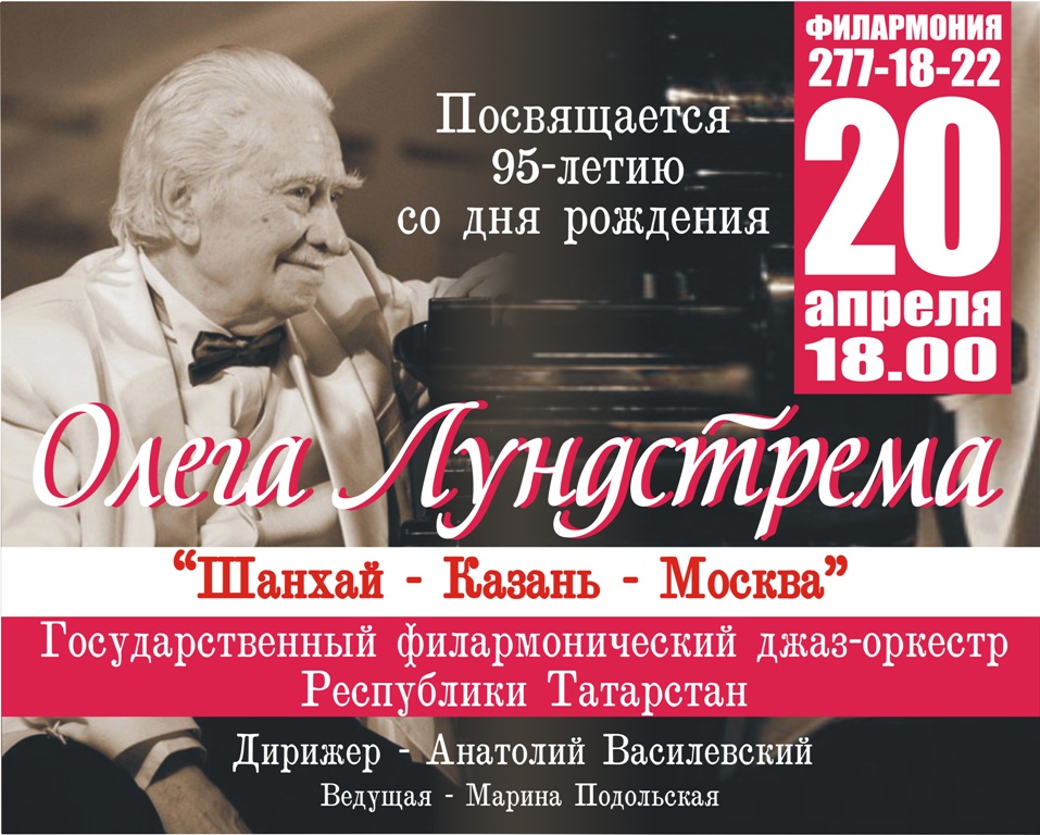 Фото №74354. «Шанхай-Казань-Пекин». 95-и летию Олега Лундстрема20 апреля - в 18.00 ч. - Концерт Филармонического джаз-оркестра РТ к 95-летию со дня рождения О. Лундстрема - "Шанхай-Казань-Москва". Дирижер - Анатолий Василевский. Ведущая - Марина Подольская. Цена билета 200-400 рублей. (программу вышлю позже) 24 апреля - в 11.00 ч. - "Музыкальные звездочки". Детский абонементный концерт Филармонического эстрадного оркестра Республики Татарстан из цикла "Интересные музыкальные знакомства". Дирижер - Ренат Закиров. На завершающем концерте на сцене филармонии вместе с оркестром выступят юные музыкальные дарования Казани, где так же примут участие сами счастливые обладатели абонементов, прошедшие предварительный кастинг.
