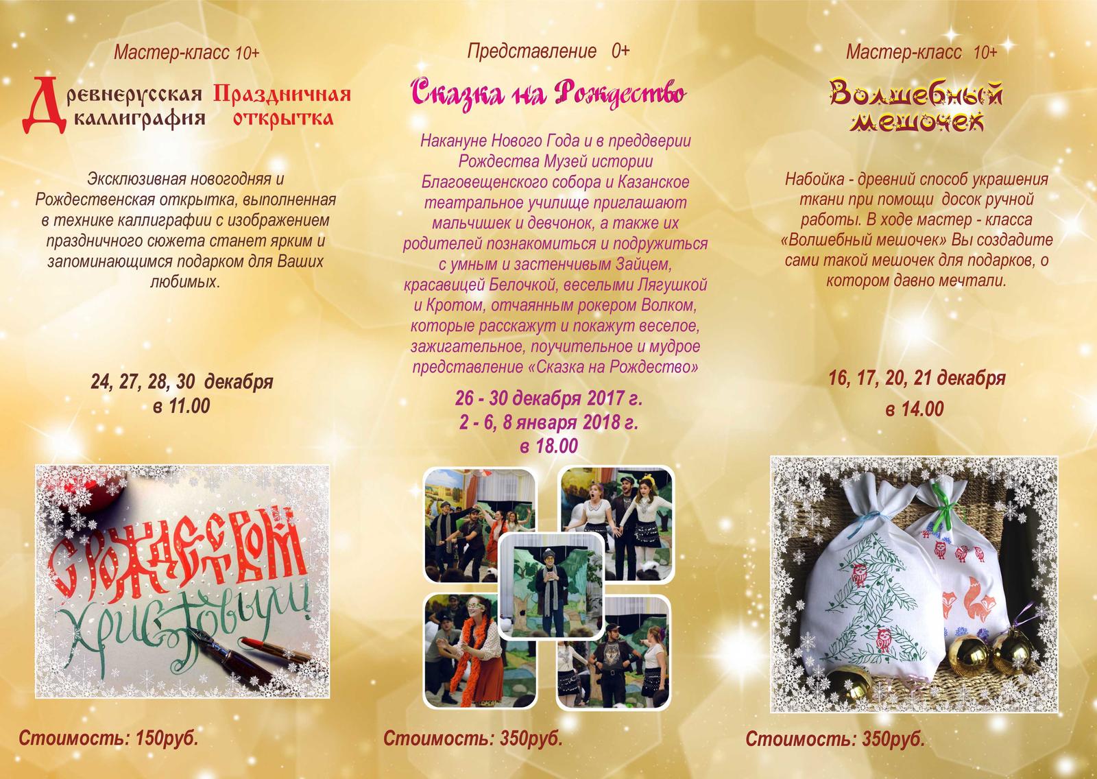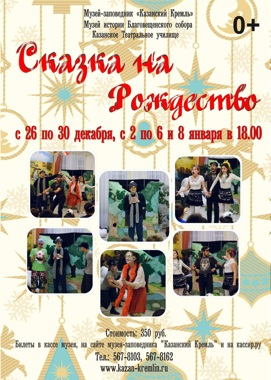 Фото №937621. афиша сказкаМузей истории Благовещенского собора приглашает накануне Нового Года и Рождества мальчишек и девчонок, а также их родителей познакомиться и подружиться с умным и застенчивым Зайцем, красавицей Белочкой, веселыми Лягушкой и Кротом и отчаянным рокером Волком, которые расскажут и покажут веселое, зажигательное, поучительное и мудрое представление «Сказка на Рождество».