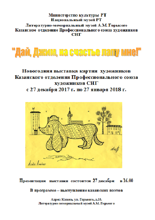 27 декабря 2017 года в 16:00 в Литературно-мемориальном музее А.М.Горького состоится открытие новогодней выставки Казанского отделения Профессионального союза художников СНГ «Дай, Джим, на счастье лапу мне».