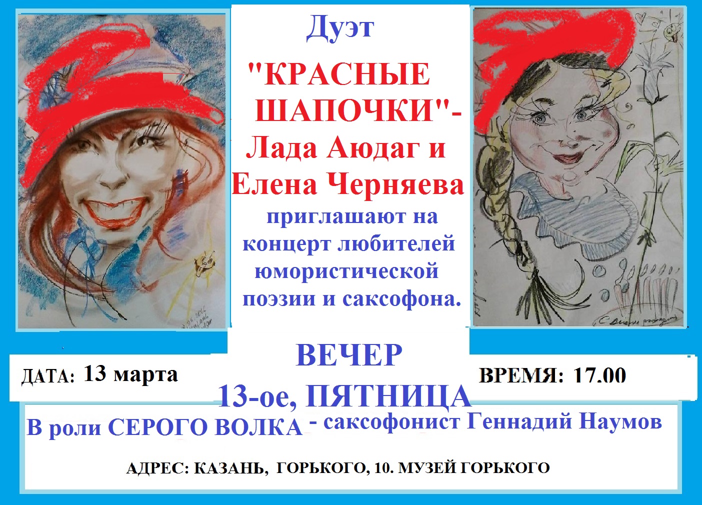 Фото №975902. АФИШАдля муз. Горького13 марта 2020 года в 17:00 в музее А.М. Горького и Ф.И. Шаляпина состоится открытие вечера «13-ое. Пятница». Казанские зрители смогут познакомиться с новыми юмористическими стихами дуэта «Красные Шапочки» казанских поэтесс: Лады Аюдаг и Елены Черняевой. И некоторыми знакомыми стихами, полюбившимися читателям из популярной дуалистической книги поэтесс - «Вам шутки дам». Также можно будет увидеть и услышать презентацию одной из песен Лады Аюдаг.