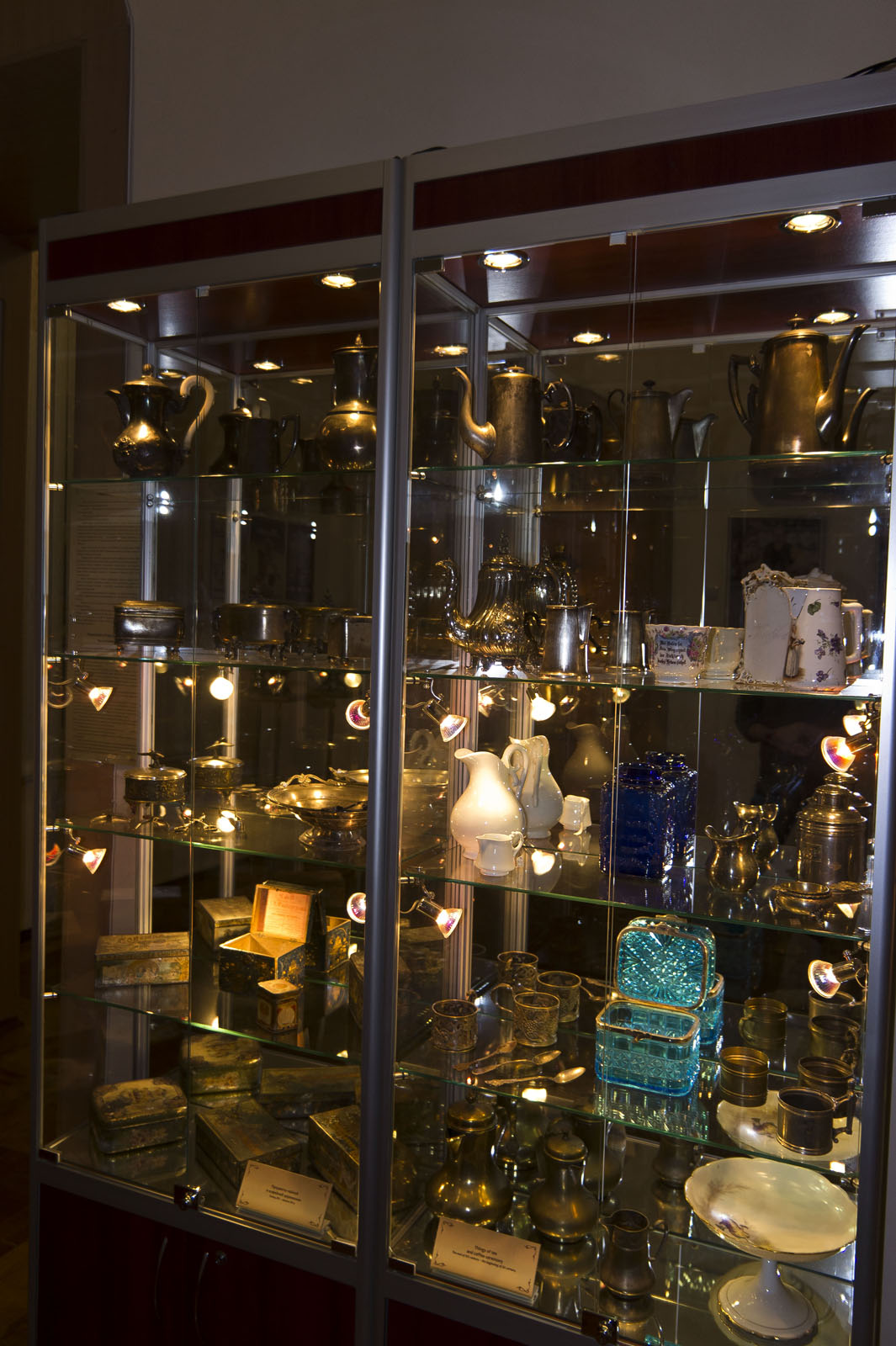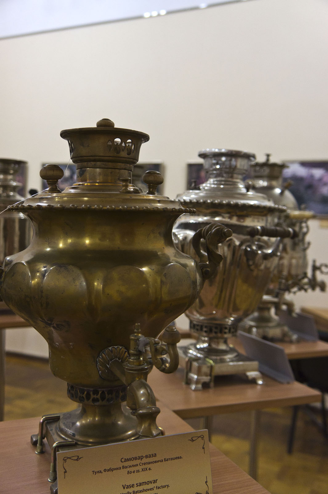 Музей Русский самовар Разнообразна форма самоваров: “банка”, “рюмка”, “шар”,”ваза”, “яйцо”, “желудь”, “дуля”, “репка” и их разновидности. Объем их также различен от самых маленьких емкостей до 200 граммов до 20 литров. Коллекция датируется сер. XIX — сер. XX вв. В экспозиции рассказывается о культуре чайной церемонии в России. Показан интерьер Чайной кон. XIX — нач. XX вв. и магазина товаров для чайной церемонии. Выставка украшена фотографиями и живописными полотнами, в лучших музейных традициях.
