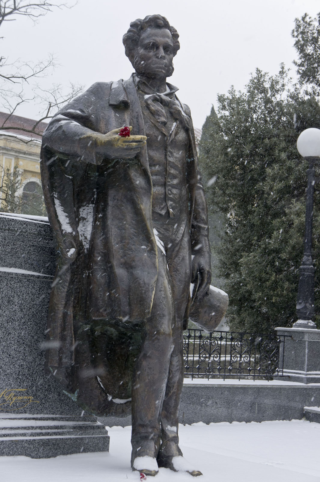 Крым. Ялта, февраль 2011;Автор проекта:Виктор Гордеев. Высота памятника — около 2,4 метра.Пушкнский бульвар в Ялте — пешеходная зона, продолжительностью 800 метров.