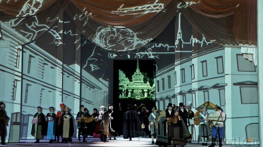 Александр Сергеевич зримо присутствует на сцене:то портрет автора, то строки из его романа в стихах, то заметки на полях, то портреты героев вырисовываются на заднике сцены. Мне лично, понравилась находка художника-декоратора при показе улицы Санкт-Петербурга. Эффект движения просто потрясающий.