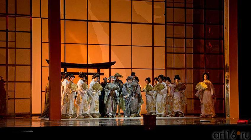 Большой ансамбль с хором передает контрастные чувства участников: опасения Шарплеса и признания влюбленного Пинкертона, восхищение или разочарование остальных.Опера ДЖ. Пуччини \"Мадам Баттерфляй\", 05.02.2012, ТГАТОиБ им. М. Джалиля.