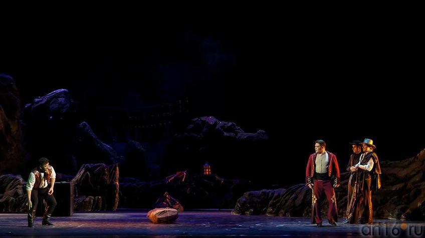 Хозе и Эскамильо готовы выяснить отношения на кинжалах, но в это время возвращаются контрабандисты за оставленным товаром и дуэль приходится прекратить;Хозе - Ахмед Агали;Эскапильо - Эдуард Цанга;контрабандисты - Ю.Ившин, Ю.Петров;Жорж Бизе \"Кармен\", 12.02.2012 ТАГТОиБ им. М.Джалиля;XXX Международный оперный фестиваль им. Ф.И.Шаляпина
