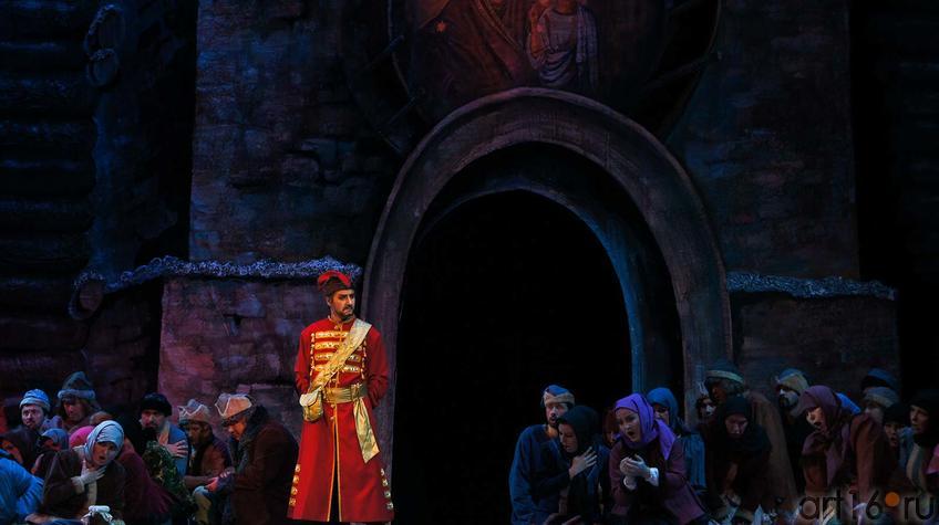 Борис останавливает бросившуюся к Юродивому стражу и просит помолиться за него. «Нельзя молиться за царя-Ирода, Богородица не велит» — ответ Юродивог;Опера \"Борис Годунов\", Модест Мусоргский;XXX Международный фестиваль им. Ф.И.Шаляпина, 13.02.2012 ТАГТОиБ им. М.Джалиля