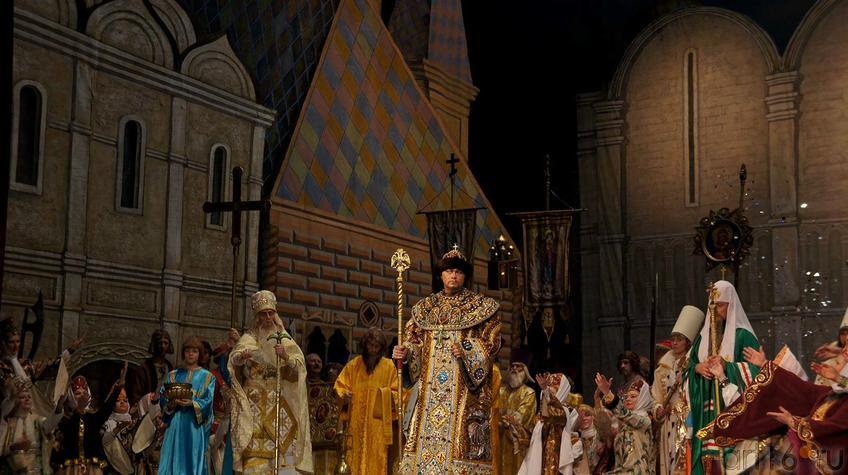 Пролог. Картина 2. Борис велит созвать народ на пир — «всех, от бояр до нищего слепца». Славление сливается с колокольным звоном