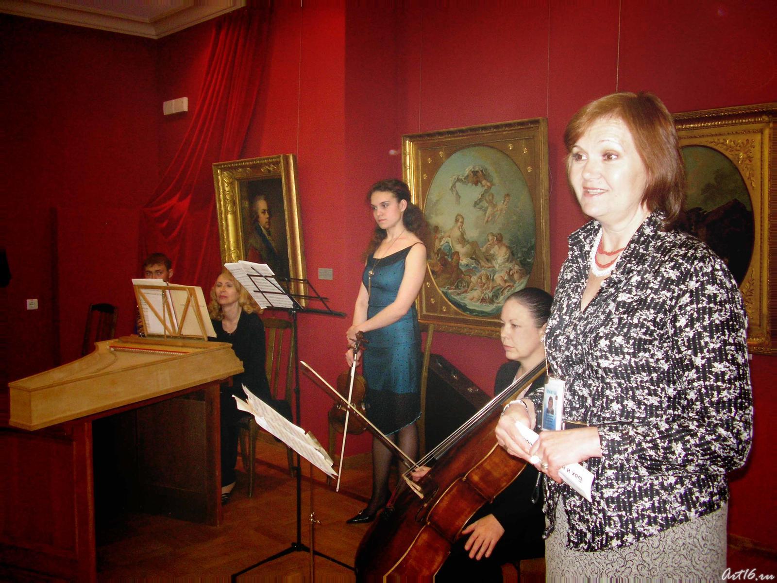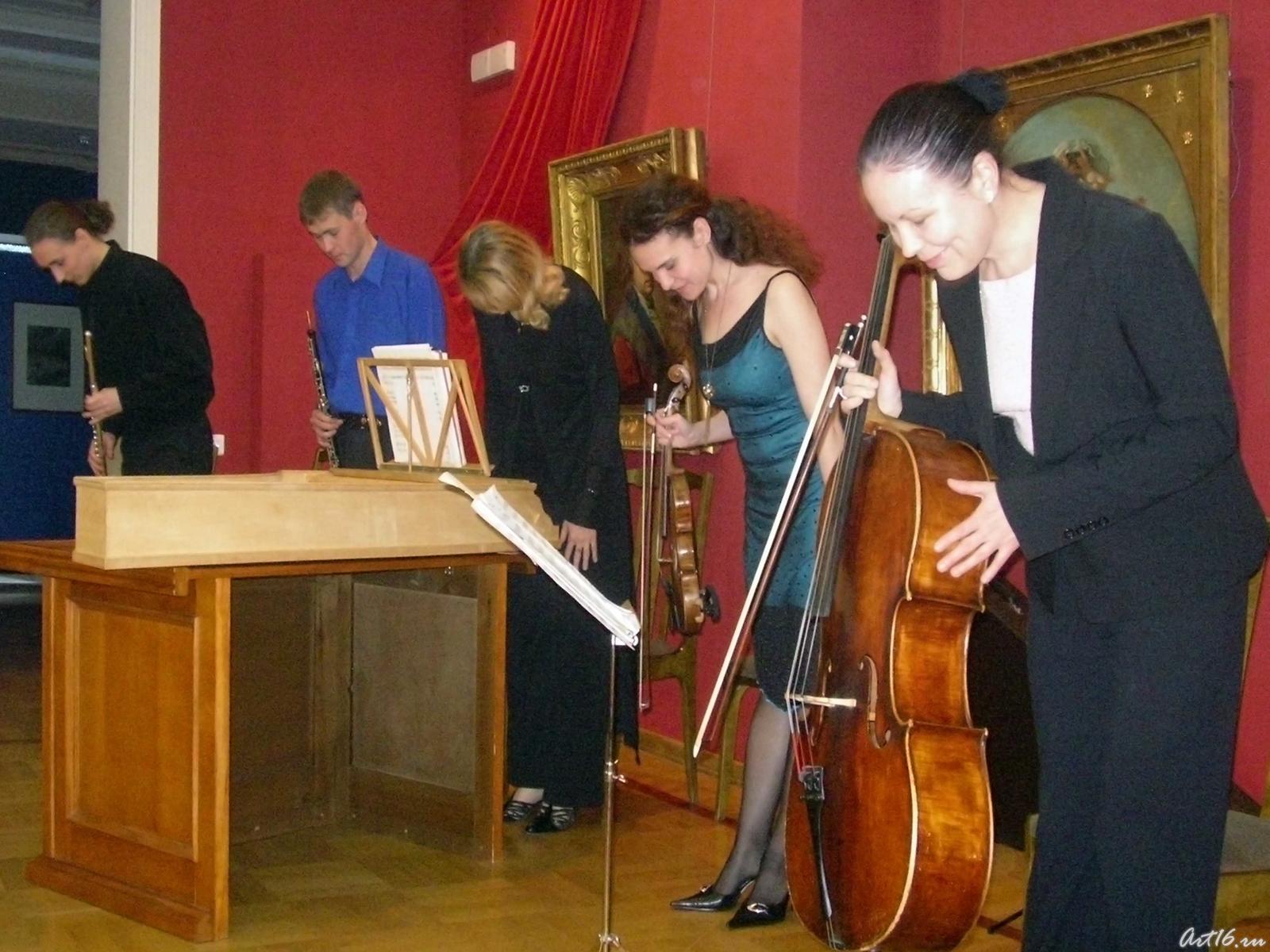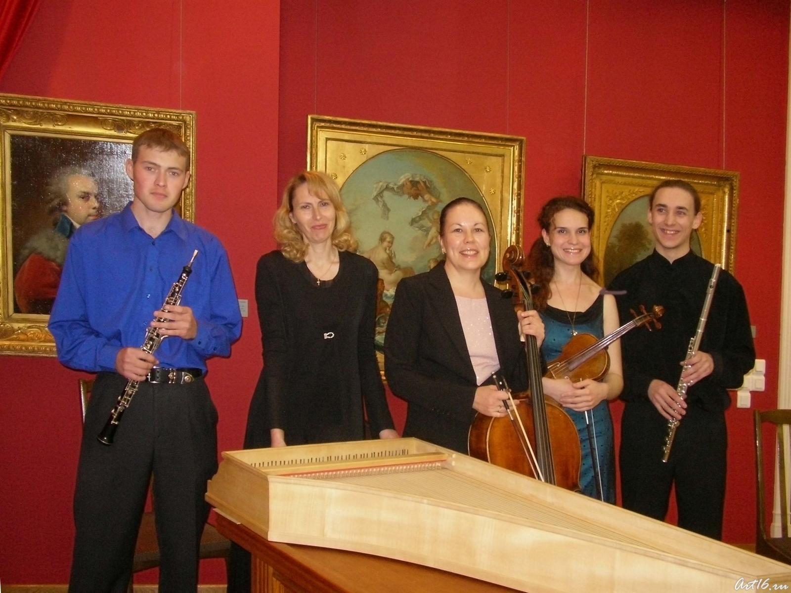 Фото №11164. Солисты ансамбля старинной музыки центра «Эрмитаж-Казань»Зульфия Асадуллина (виолончель) Елена Бурундуковская (клавесин) Виктор Воробьёв (флейта) Алсу Камалиева (скрипка) Андрей Шубин (гобой)