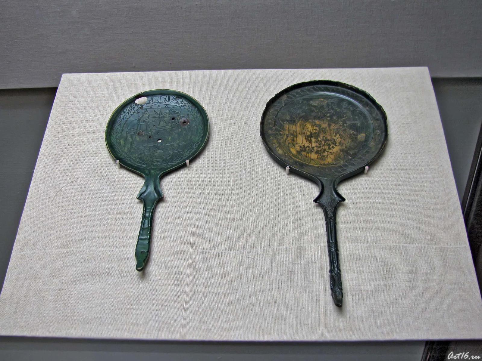 Фото №35439. Этрусское зеркало — Диоскуры /Этрусское зеркало — Суд ПарисаБронза, патина зелёная /Бронза, патина темно-коричневая