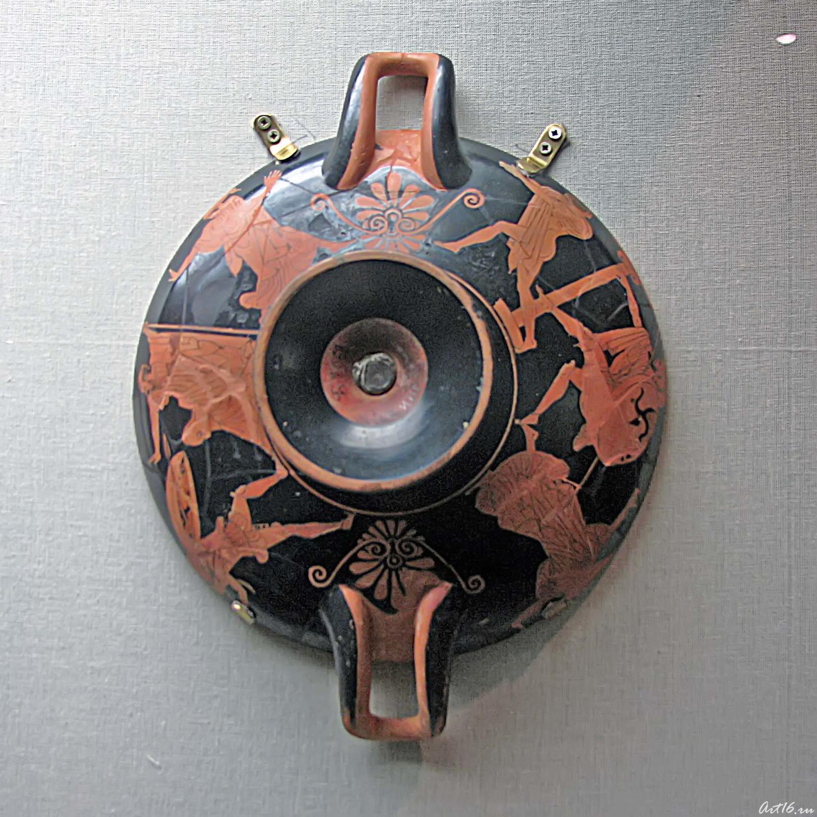 Фото №35529. Килик краснофигурный. А, Б: Долон, Одиссей и Диомед. Тондо: Бегущий воинглина