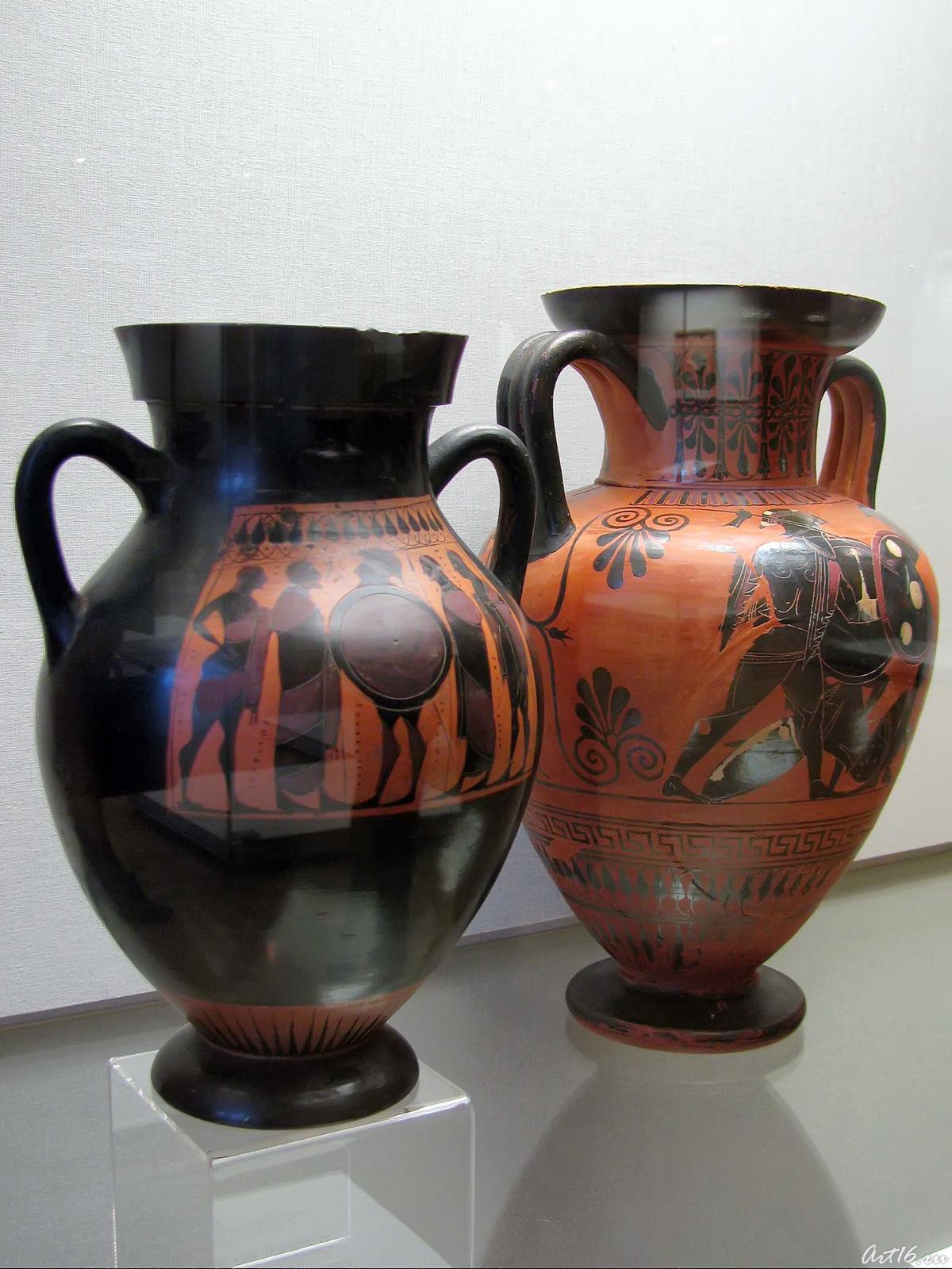 Фото №35584. Амфора чернофигурная: Проводы воина /Амфора чернофигурная.Ф: Поединок над раненым. Б: Воин, две женщины и стрелокглина