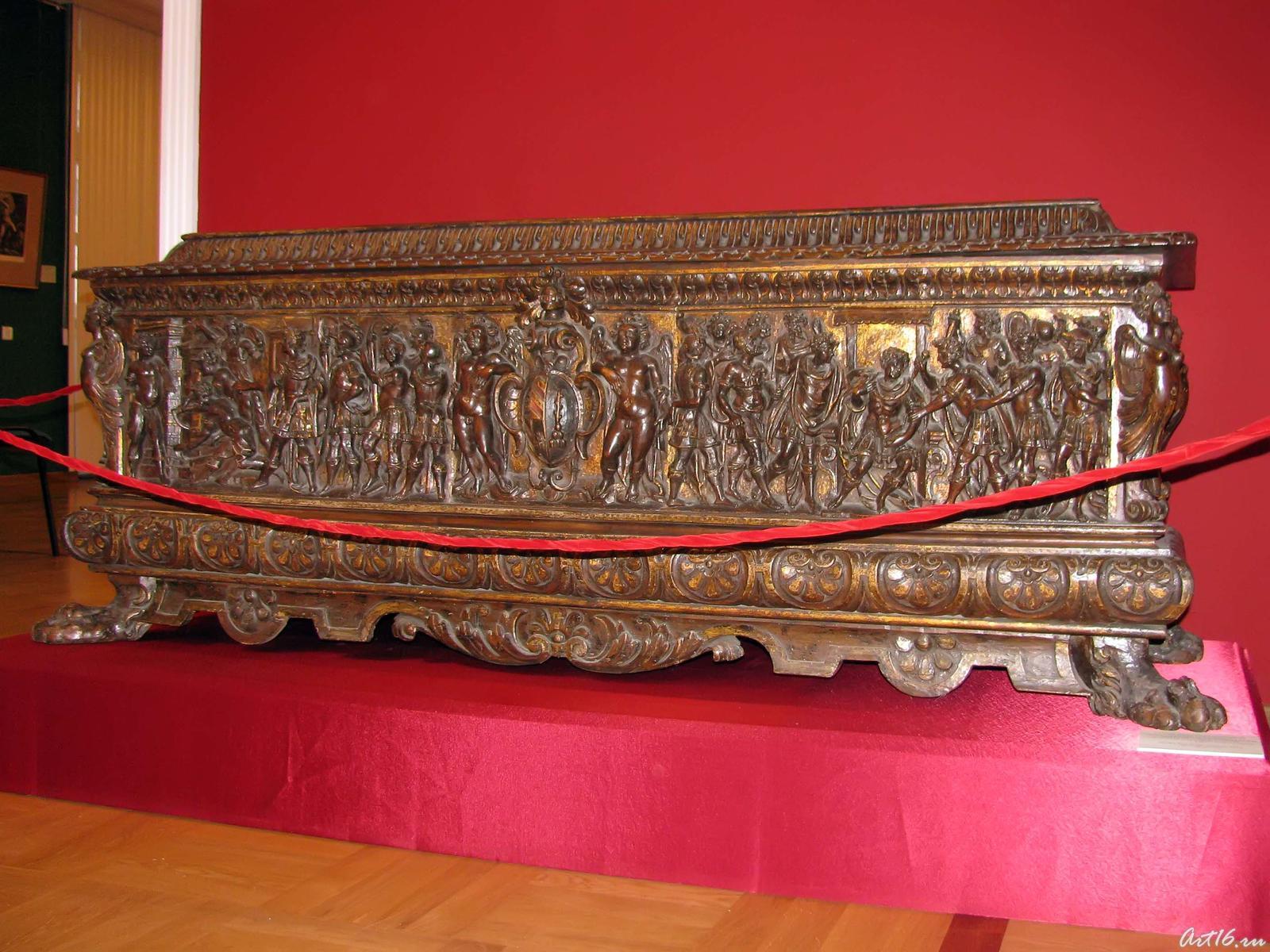 Фото №35624. Сундук-кассоне со сценами из истории Юлия Цезаряорех; резбьба, золочение