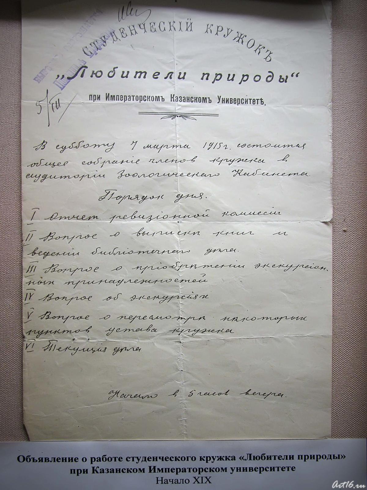 Фото №39879. Объявление о работе студенческого кружка «Любители природы», при Казанском Императорском университетевыставка «Учитель и ученик», посвященная крупнейшим ученым Н.И. Воробьёву и Е.П. Бусыгину.
