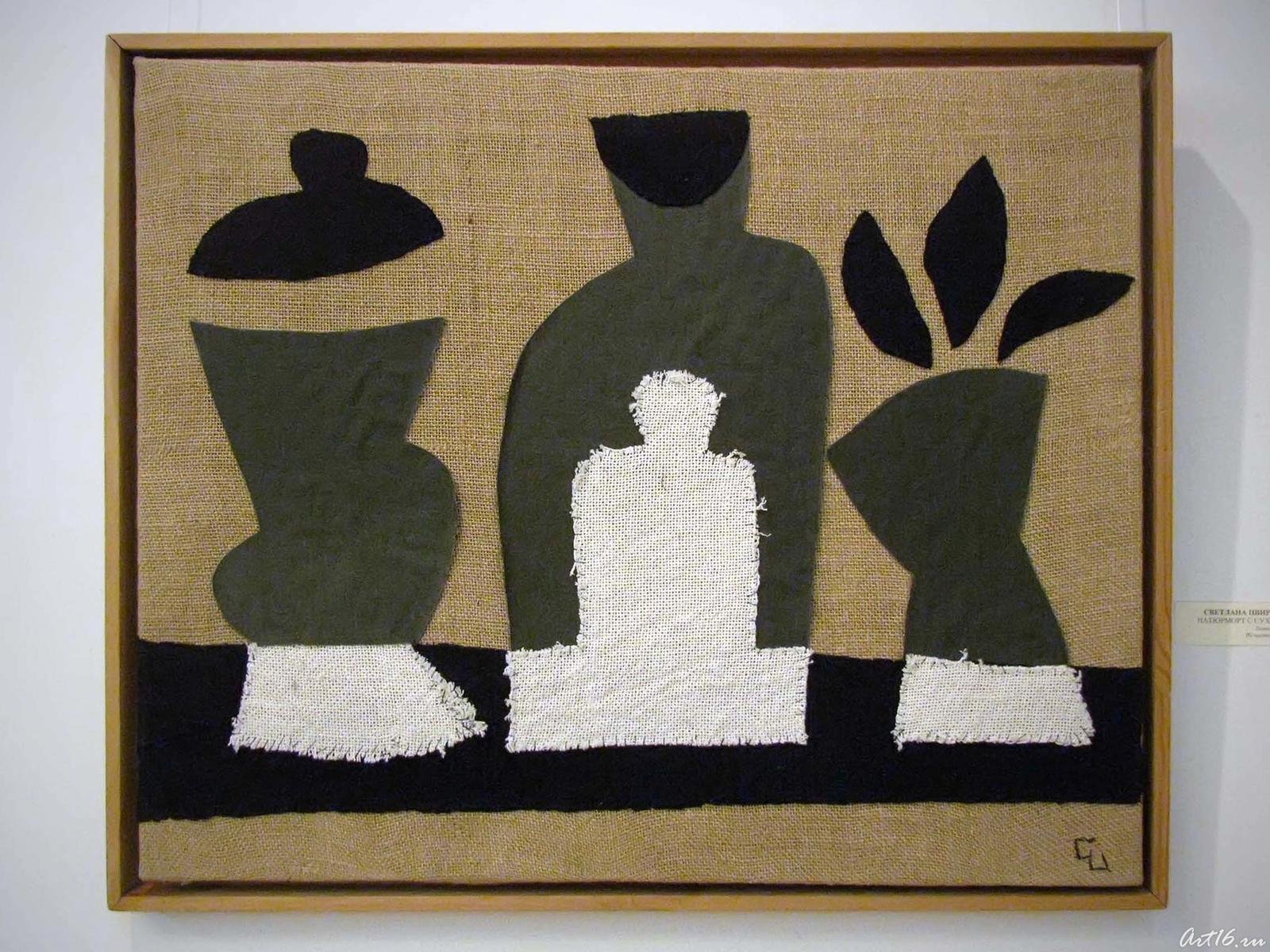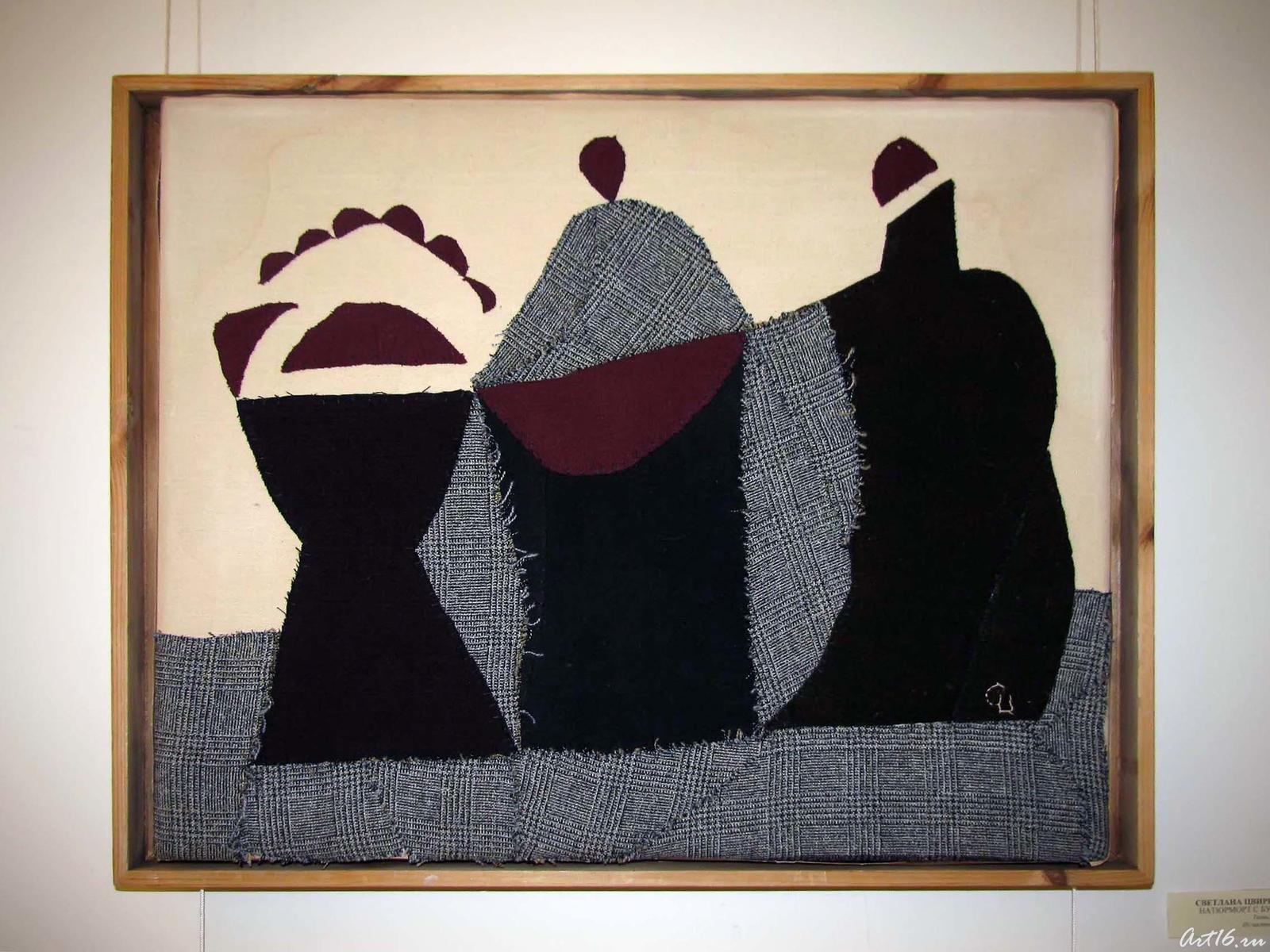 Фото №41568. Натюрморт с бутылками. 2001ткань. коллаж;