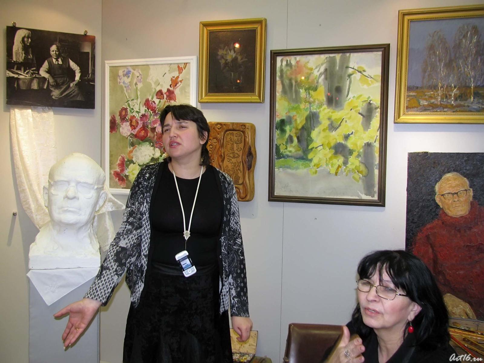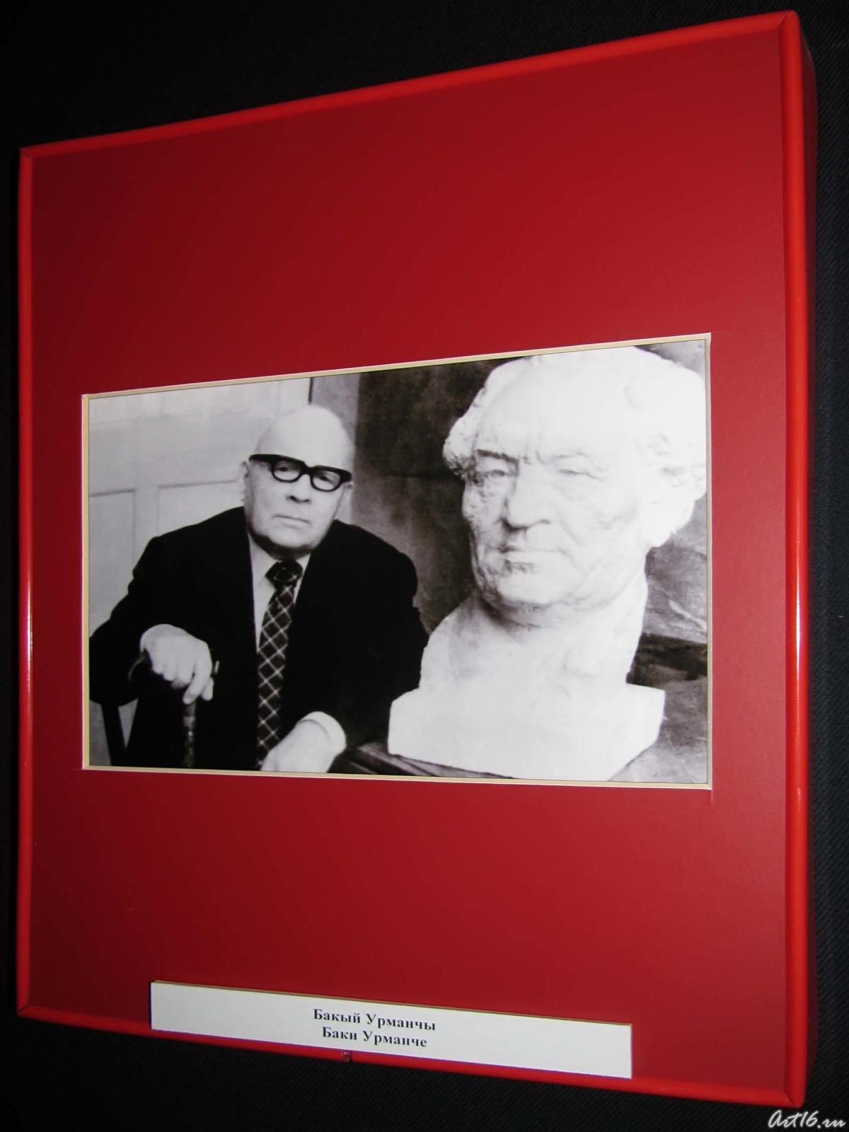 Фото №43546. Люция Ахметзянова, Розалина ШагееваСтенд с фотографиями Б. Урманче: его фотопортрет 1936 года, Урманче в мастерской, с учениками казанской художественной школы, почетный гражданин Казани. 1988 г., с девочкой, фото у скульптуры «Братское сердце». 1949 и много других. Центральное место в мемориальной экспозиции занимает бюст Б. Урманче, созданный автором. На стене за скульптурой две акварели Баки Идрисовича и подарки друзей художника.