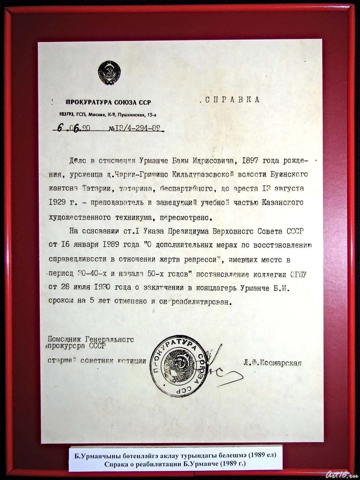 Фото №43396. Справка о реабилитации Баки Урманче. 1989 г.
