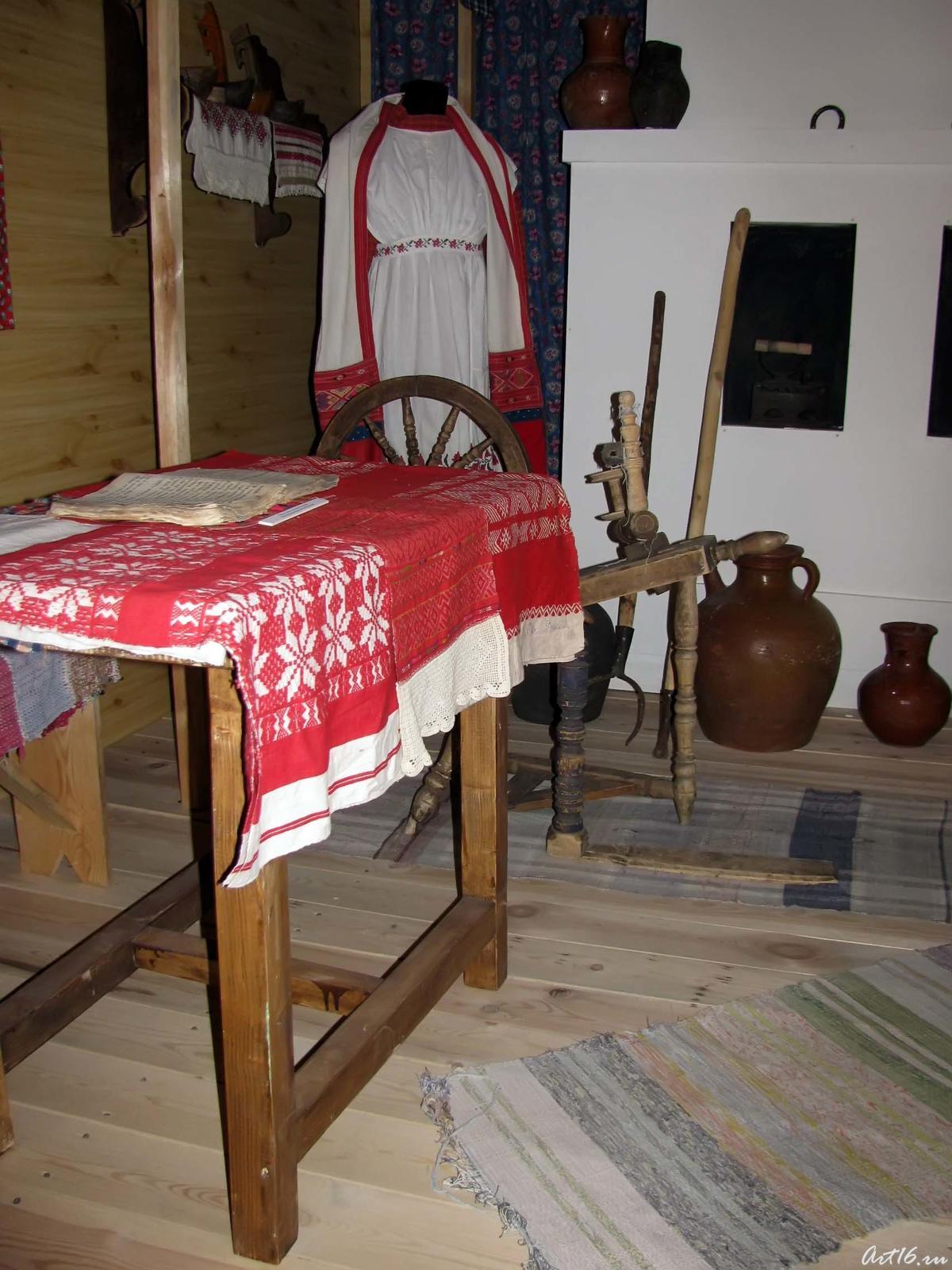 Деревянная кровать (СЕКЕ) (Н. Наратбаш - закупка), занавес для колыбельки, вышивка ручная для кровати, ичиги (19, 20в - 2 пары), прялка, калфак (обновить), комзол (обновить), утюг (3 разновидности), платье жен. татарское, украшения (браслет, серьги, чулпар, кольца, брошь), ткацкий станок.