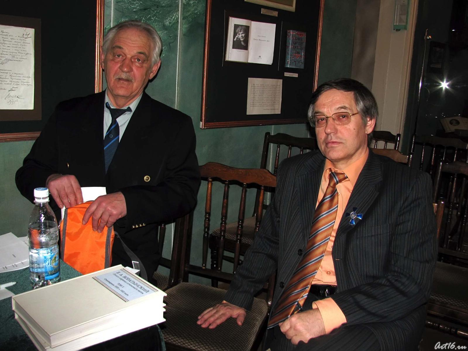 Фото №52165. Б.М.Куницын, А.М.ЕлдашевЕлдашев Анатолий Михайлович, председатель городского общества историков-краеведов, преподаватель казанской духовной семинарии. В течение 10-13 последних лет темой его исследований являются монастыри, монашество, священники, некрополи. Для чтений 2010 года Анатолий Михайлович подготовил доклад об Иване Петровиче Паленине (1804-1891), священнике села Юматово. И.П.Паленин служил в храме в 1835-1839 и в 1873-1891 гг. Запомнился как глубоко аскетичный человек, носивший вериги и тщательно скрывающий это, раздающий бедным все свое имущество и неистово отстаивающий интересы крепостных крестьян, обличая жестокость помещиков в проповедях. Анатолий Михайлович показал фотографию И.П.Паленина. С фотографии смотрит добрый, чрезвычайно светлый человек - священник Преображенской церкви села Юматово, любящий и несущий доброту людям. А.М.Елдашев выступает на чтениях в усадьбе Боратынских каждый год. Он просил меня особо отметить большой личный вклад в организации чтений, заведующей музеем Е.А.Боратынского, Ирины Васильевны Завьяловой.