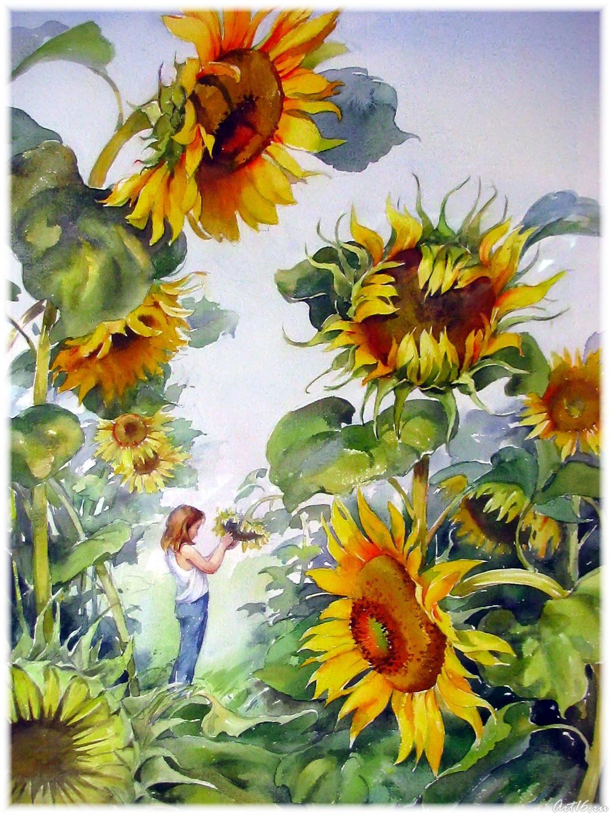 Фото №54640. Подсолнухи. 2009Расцвет классической водяной техники, идентичной акварельной наблюдается в период династии Тан (VIII веке). В те времена, именитые художники служили во дворцах императоров в качестве секретарей. Секретарь императорского дворца должен был помимо таланта живописца иметь и литературные таланты. Содержание картины нередко сопровождалось стихотворным текстом - иероглифом.