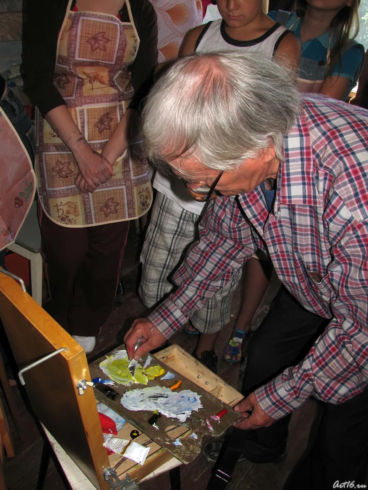 Фото №57375. Р. Гусманов размешивает краски, до получения нужного цветаМастер-класс с Рашидом ГусмановымДва с половиной часа «коллективного» творчества, коллективного только в силу одновременного освоения техники «алла прима».