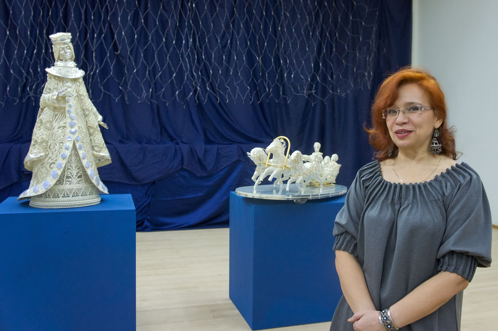 Фото №67897. Медведева Татьяна Рафаиловна, ведущий художник завода «Красносельский Ювелирпром»15 декабря 2010 года в Центре «Эрмитаж-Казань» открылась выставка «Серебряное Рождество». Ее экспозиционное пространство охватывает три зала. В основном представлены изделия из серебра завода «Красносельский Ювелирпром» - ожерелья, кольца, серьги, браслеты, вазы, кубки, изделиях посудной группы, скань, подвески, сувенирная продукция. Две витрины демонстрируют изделия выполненные молодыми мастерами из Красносельского училища художественной обработки металлов (КУХОМ) - гарнитуры, кольца, серьги, браслеты. Пару витрин представила на выставку Ювелирная компания «Алмаз-Холдинг». Всего в экспозиции около 350 серебряных изделий.