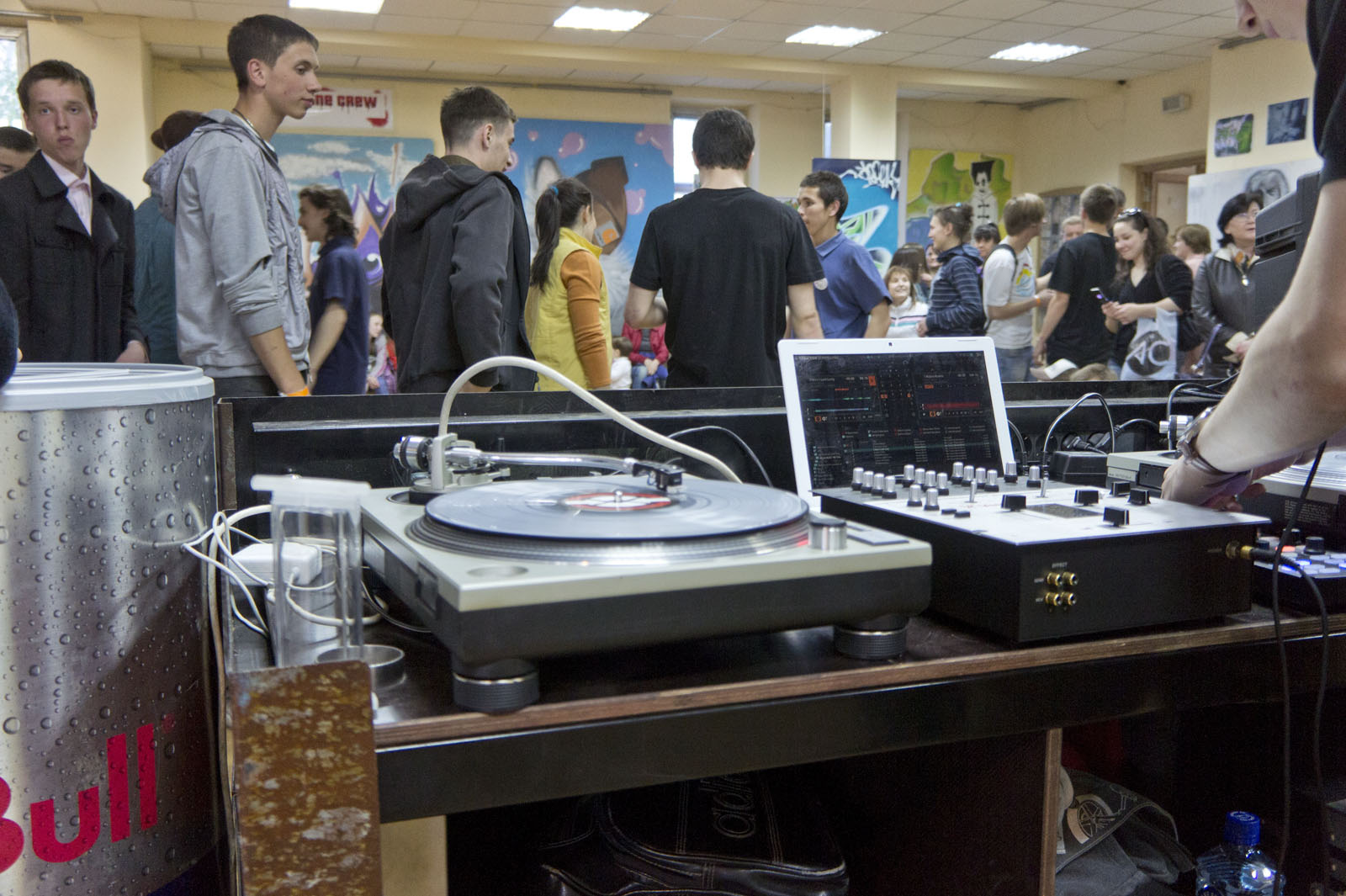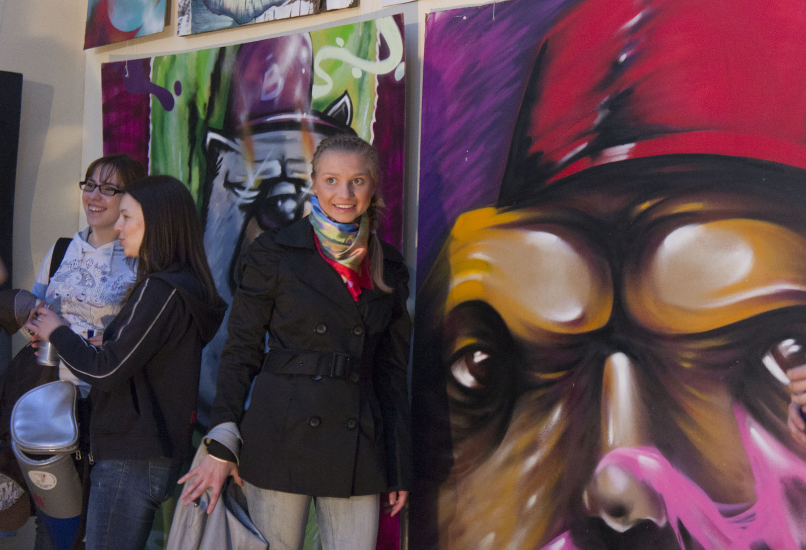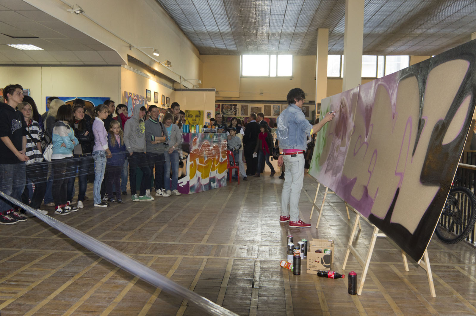 Фото №78119. Диджейская программа в Выставочном зале ГМИИ РТ\"Ночь в музее\", 14 мая 2011,КазаньВ зале пахнет свежей краской. Да и не мудрено, ведь в дело идут баллончики с краской. Перед глазами публики рождаются шедевры граффити.