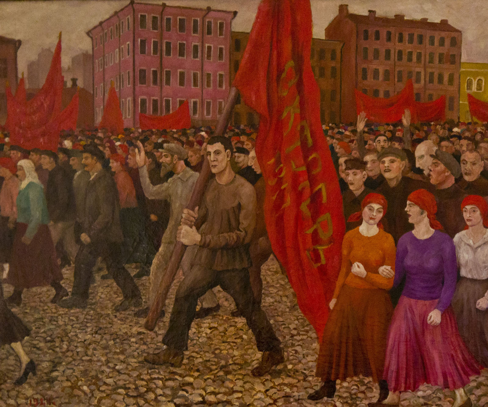 Фото №79899. Монин А.А (1896-1969). Демонстрация. 1924холст, маслоДальнейшему развитию инфраструктуры горда помешала Великая Отечественная война. Лишь после войны работы по реконструкции и развитию города начались вновь. Возведенные в 1952-1957 гг. высотки стали символом советской Москвы.