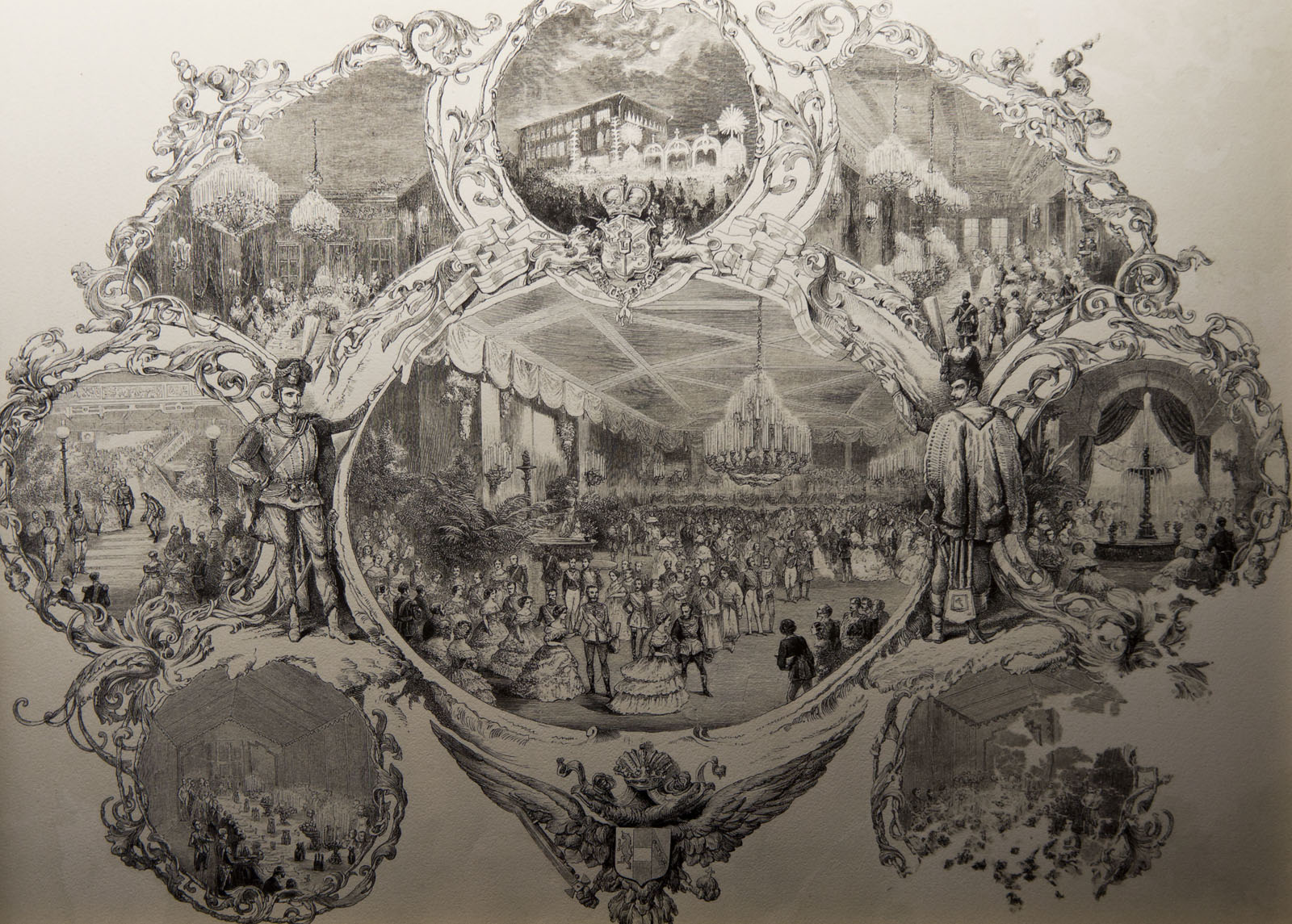 бумага, ксилографияВ Москве, начиная с XVI века проходили коронации русских царей. Перенос столицы в Петербург не изменил эту традицию. На время коронации в Москву приезжал двор и гвардия: вдоль пути следования царского поезда возводились триумфальные арки и трибуны для зрителей. Устраивались фейерверки и иллюминации. В экспозиции это событие показано на графических листах и серии исторической фотографии.