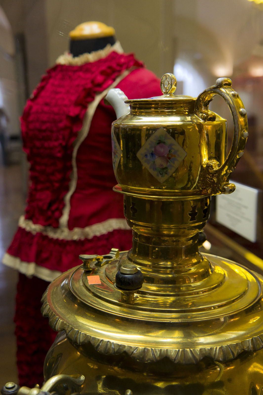 Фото №80029. Платье дамское /Сервиз чайный (часть) с росписью розами в ромбических резервах/ самовар "ваза граненая" 1880-е гг, шерсть, х/б ткань, кружево / Россия, кон. XIX нач. XX вв. /конец XIX в., латунь