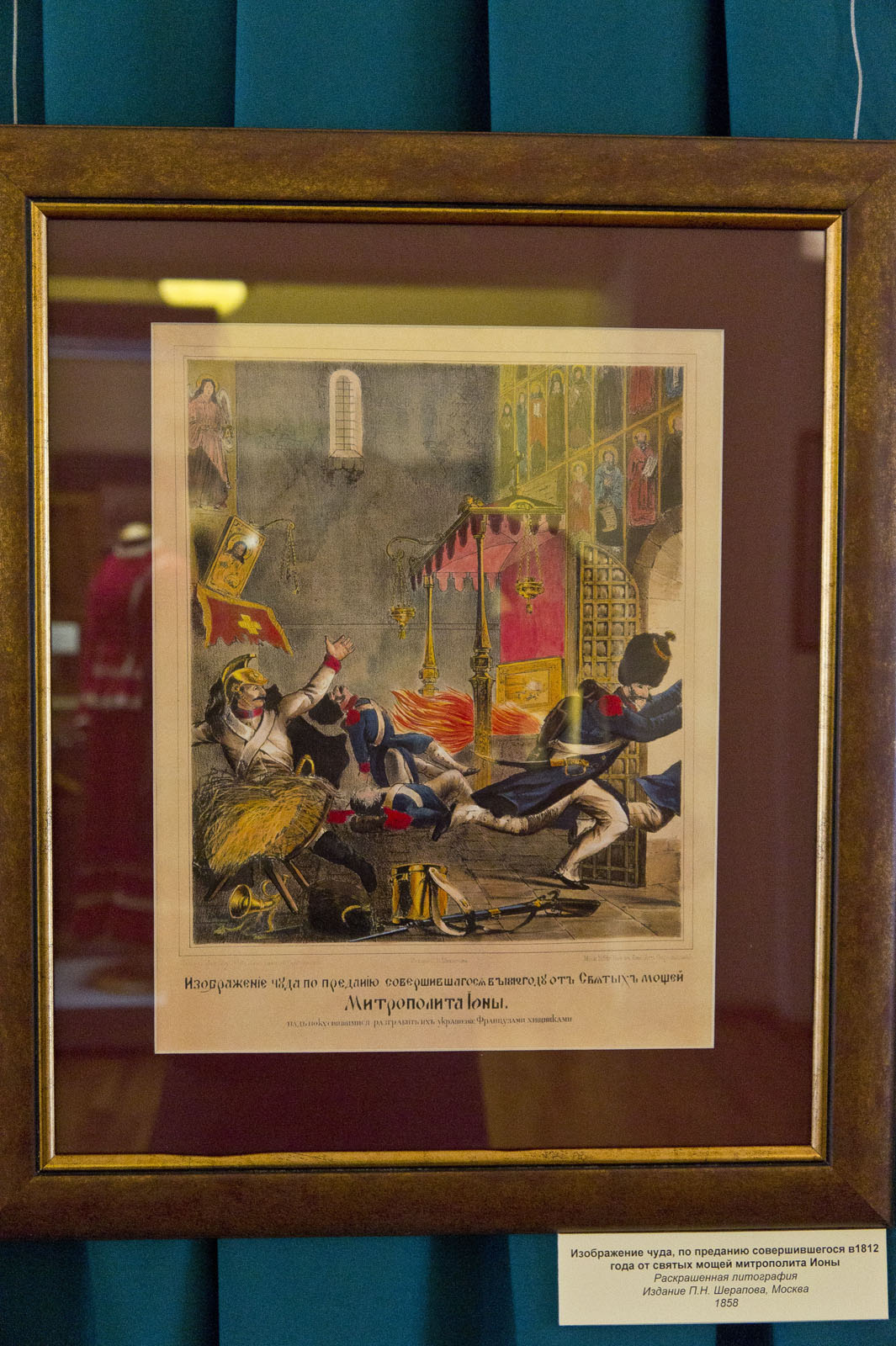 Фото №80039. Изображение чуда, по преданию совершившегося в 1812 году от святых мощей митрополита Ионыраскрашенная литография; издание П.Н.Шерапова, Москва, 1858Триумфальные ворота были установлены на площади Тверской заставы (площадь Белорусского вокзала) на месте деревянной арки, сооруженной в 1814 году для торжественной встречи русских войск, возвращавшихся из Парижа после победы над французскими войсками.
