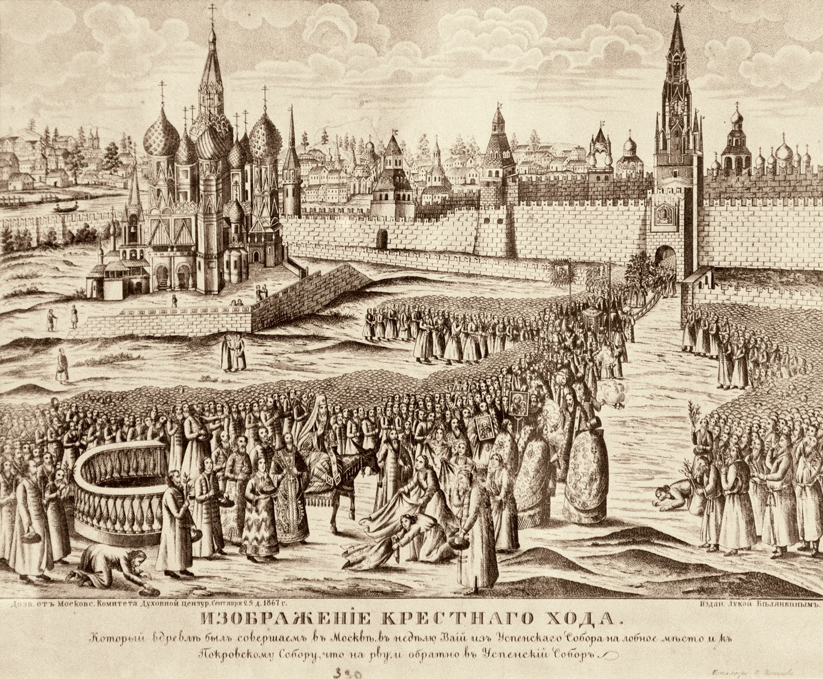 Фото №80049. "Изображение крестного хода, который вдревле был свершаем в Москве...". 1867Гравер П.Копылов, издание Луки Белянкина,бумага, гравюра на металле;В XVII веке шествие проходило от Успенского собора через Спасские ворота к входоиерусалимскому приделу Покровского собора (храм Василия Блаженного). Праздничное действие начиналось так: После утренней обедни царь входил в Успенский собор в праздничной одежде. Его сопровождали бояре, окольничьи и другие придворные чины. Царь и патриарх входили в придел Входа в Иерусалим Покровского собора, где царь совершив молитву, возлагал на себя сан (царские одежды): крест, бармы (драгоценное оплечье, украшенное изображениями религиозного характера. Впервые в России бармы появились у московского князя Ивана Калиты (XIV в), царскую шапку и.т.д. На Лобном месте устанавливали налой (род столика или поставца на ножках, с пологою столешницею) с Евангелием и иконы Иоанна Предтечи и Николая Чудотворца. На Красной площади стояли стрельцы и собиралась толпа народа. Недалеко от Лобного места стоял осля - накрытая каптуром (вид попоны) лошадь. Там же располагалась нарядная верба украшением которой служили: изюмом, грецкие орехами, финиками, а с 1634 года - яблоки. После праздника патриарх раздавал яблоки духовным и светским чинам. Самые крупные яблоки отправлялись во дворец - царской семье. После выхода царя и патриарха из собора, патриарх поднимался на украшенное Лобное место, и вручал царю пальмовую ветвь и ветки вербы. Патриарх и митрополиты раздавали ветки вербы людям. Затем патриарх садился на осля, держа в одной руке Евангелие, а в другой крест. Царь вел осля за конец повода. Перед этой процессией везли украшенную вербу. Когда шествие вступало в Спасские ворота, на всех церквях Кремля начинался колокольный звон. Звон продолжался до вступления процессии в Успенский собор. Верба оставалась у южных дверей собора. По царскому Указу с 1669 года Шествие на осляти проводилось в городах: Астрахань, Рязань, Казань, Тобольск. Соборным уложением 1678 года Шествие на осляти в городах были запрещены, и проводились только в Москве. После 1693 года документов о проведении шествия не сохранилось.