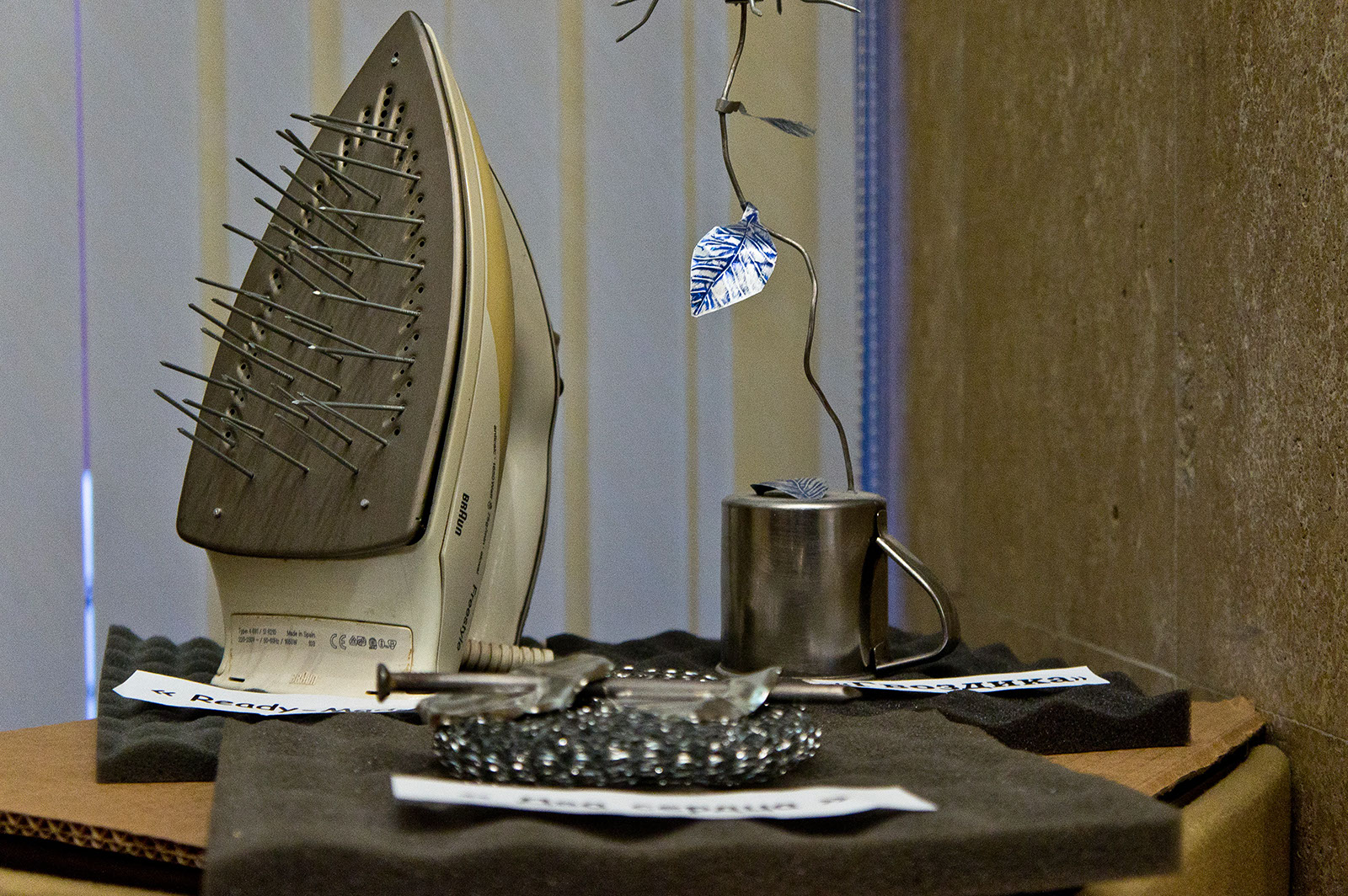 Фото №88188. Евгений Якимов, Сергей ТрофимовВот их рассказ о своих творениях: - Подарки на 8 марта. Обычно женщинам дарят бытовую технику, цветы, открытки. Мы решили отделить подарок от утилитарности. Это все сделано из мусора, мусором и является. С другой стороны, это же подарок, причем подарок в чистом виде. Его невозможно использовать: кружка дырявая, утюг, вообще выведен из строя.