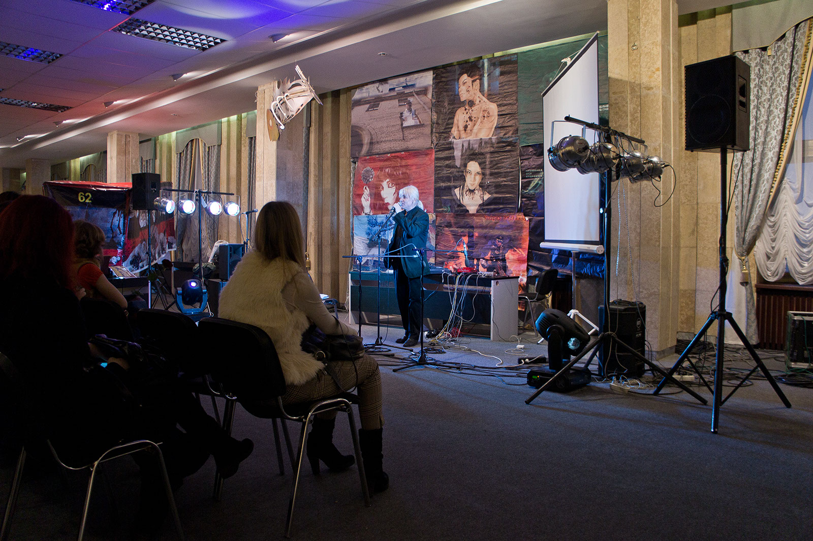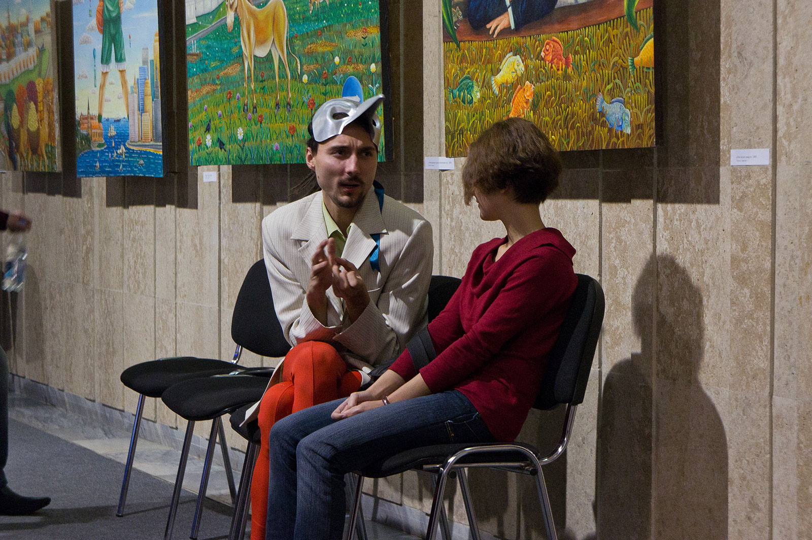 Фото №88223. Выступление казанских поэтов на фестивале «Трипфест»Литературные чтения проходили в экспозиционном пространстве выставки казанского художника-наивиста Альфрида Шаймарданова “Счастье навсегда”. Художник был здесь же, и с удовольствием отвечал на вопросы, заинтересовавшихся его творчеством посетителей.