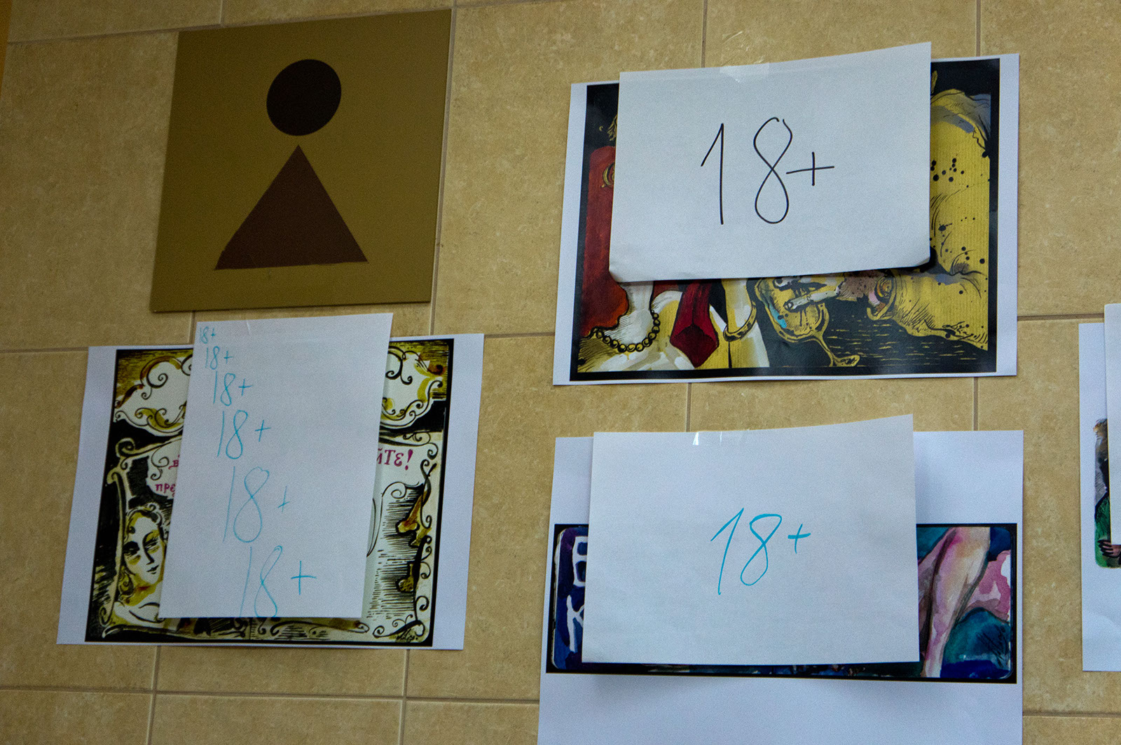 Фото №88258. Фойе НКЦ «Казань» в день проведения ТРИПФЕСТАПоскольку вход был свободный и рамки времени посещения размыты до девяти с половиной часов к ряду, то в фойе наблюдалось постоянное броуновское движение. Мраморные стены и колонны первого этажа НКЦ вместили в себя столько графики, что внимательное рассмотрение графических рисунков могло занять не один час. Привлекали внимание пришпиленные к некоторым рисункам белоснежные листы с надписью “18+”. Это организаторы выставки креативно вышли из положения “Здесь же бывают дети!”.