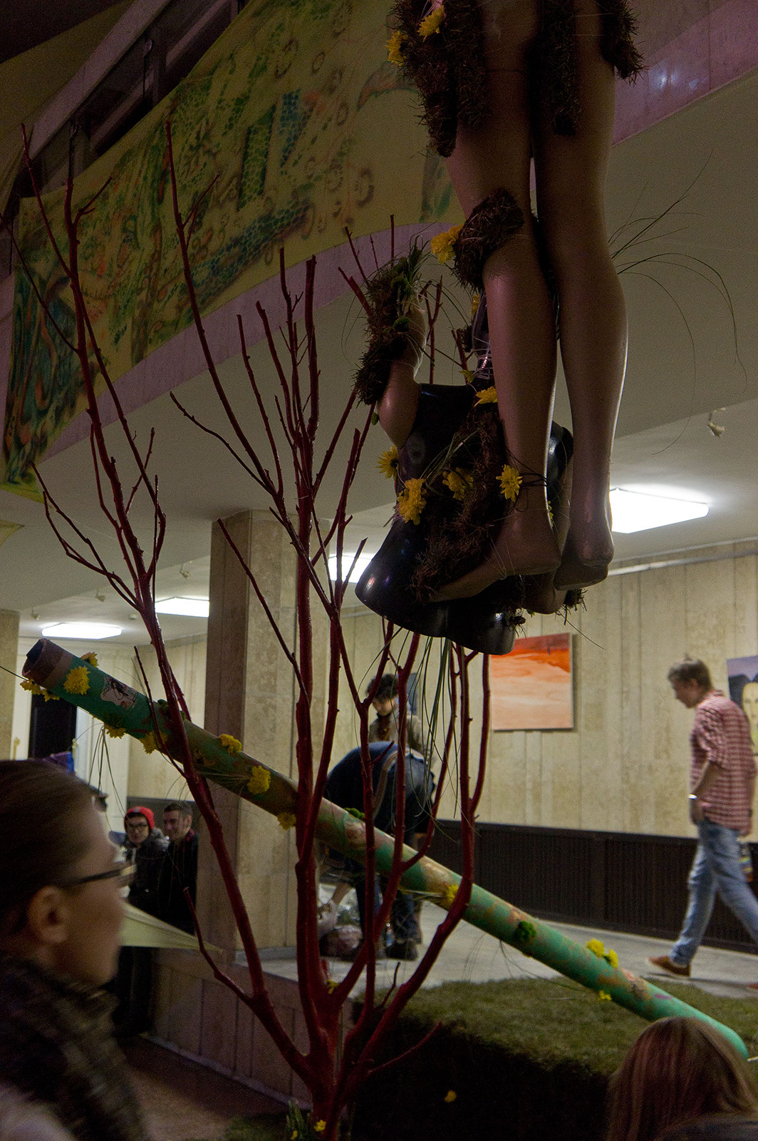Фото №88203. Ризома. Е Якимов, С.ТрофимовЭту работу, завершающую экспозицию Е. Якимова и С.Трофимов, сами художники-авангардисты презентуют, как набат, призыв к занятию творчеством. Чтобы охватить всю разнообразную программу фестиваля приходится постоянно перемещаться от площадки к площадке. В холле, где в режиме нон-стор выступают различные музыкальные коллективы, замечаю “Райский уголок”.