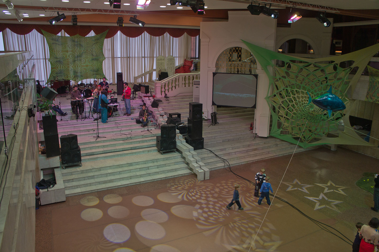 Фото №88625. Граффити на фестивале "ТРИПФЕСТ-2011"С этой площадки можно было наблюдать за выступлениями музыкальных коллективов, проходящих в холле первого этажа. Да и летающая рыба поближе.