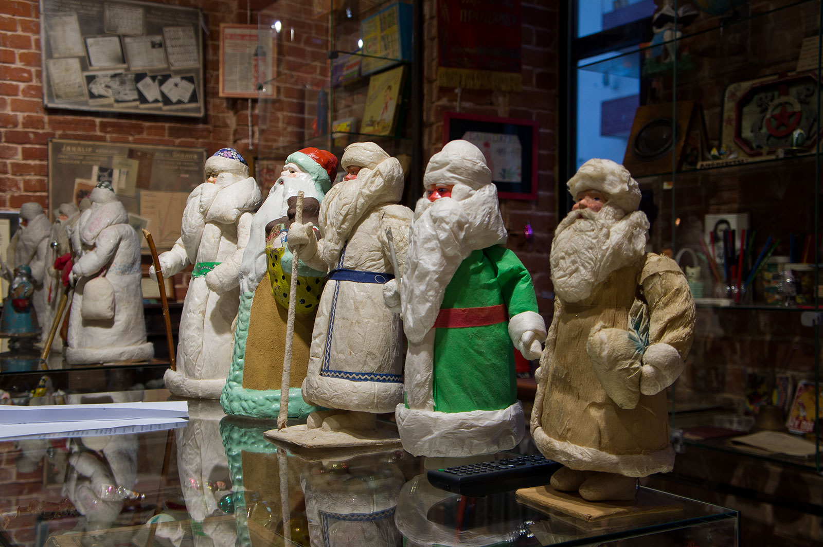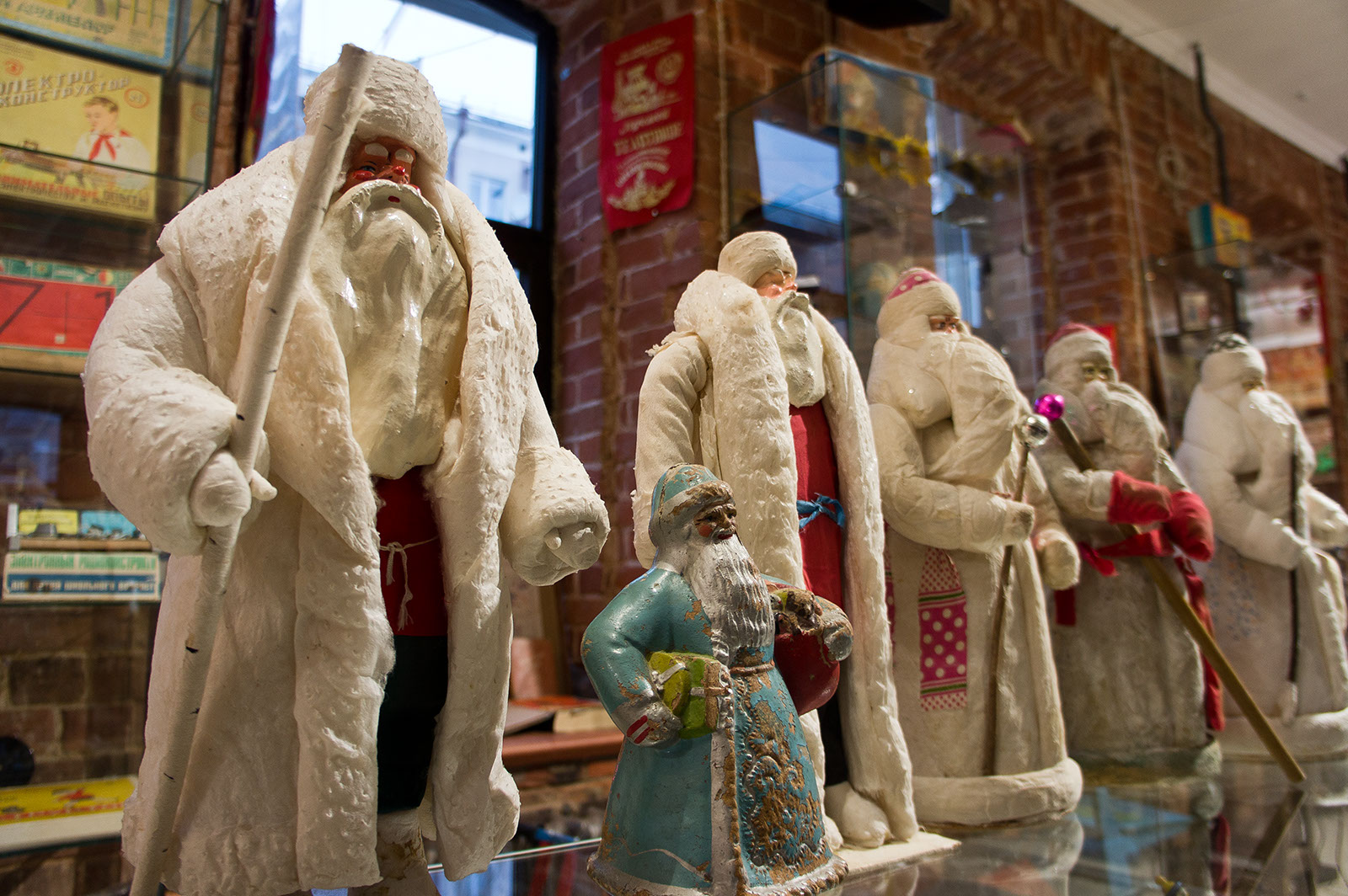 Фото №89005. Деды Морозы 1930-х—1970- х гг.Костюмы советских Дедов Морозов изготавливались из бумаги и ваты, а лица до середины 70-х годов прошлого века делались из папье-маше. Причем каждое лицо сказочного дедушки раскрашивалось вручную, и было абсолютно индивидуальным, в том числе зависело от настроения художника – какие-то дедушки были веселее, какие-то отличались более серьезным нравом.20 декабря 2011 года в Музее социалистического быта директор музея Рустем Валиахметов провел презентацию новогоднего проекта, выставки «Советский Новый год».