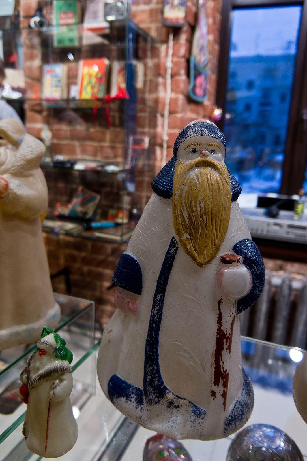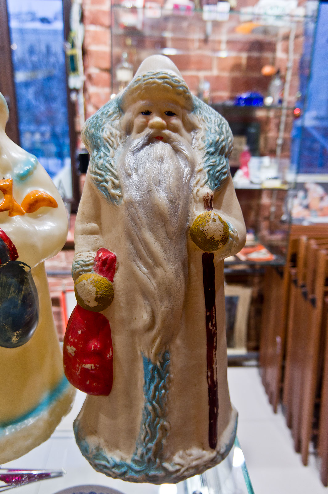 Фото №89050. Елочные игрушки 1960-70 гг.На выставке “Советский Новый год” представлена большая коллекция Дедов Морозов, половина из которых изготовлена вручную. Костюмы таких Дедов Морозов делали из бумаги и ваты, а лица - из папье-маше. Каждое лицо сказочного дедушки раскрашивалось вручную, и было абсолютно индивидуальным, в том числе зависело от настроения художника – какие-то дедушки были веселее, какие-то отличались более серьезным нравом. Несмотря на то, что каждый дед Мороз был индивидуален, стоил он не дорого, максимально 2 рубля.